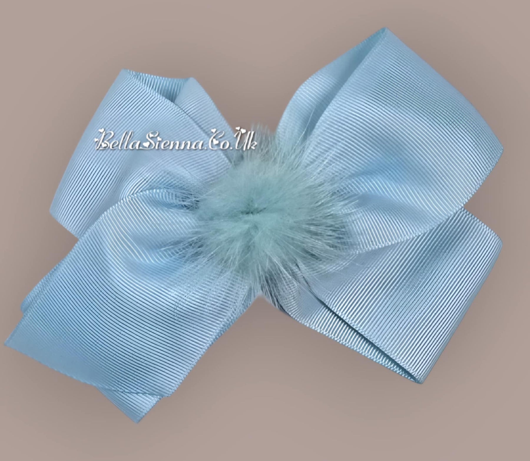 Bowtique London 4 Inch Blue Grosgrain Medium Size Hair Bow With Fur Pom