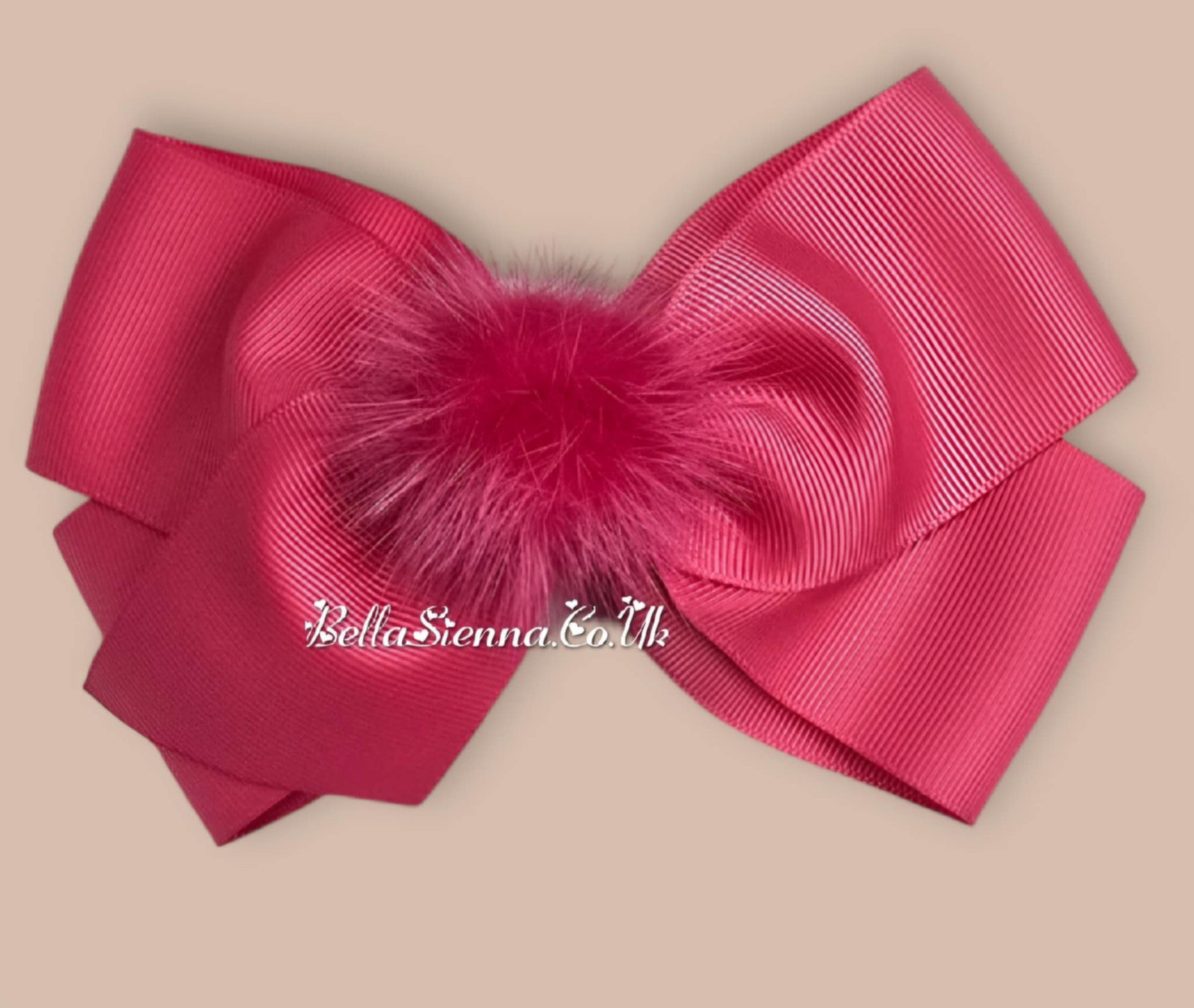 Bowtique London 6 Inch Fuchsia Pink Grosgrain Large Hair Bow With Fur Pom
