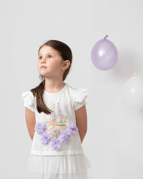 Caramelo Kids diamante Carousel Leggings Set. Featuring a diamante set against a lilac background. Crafted from lightweight and breathable fabric, this set provides comfort and flexibility for your child.