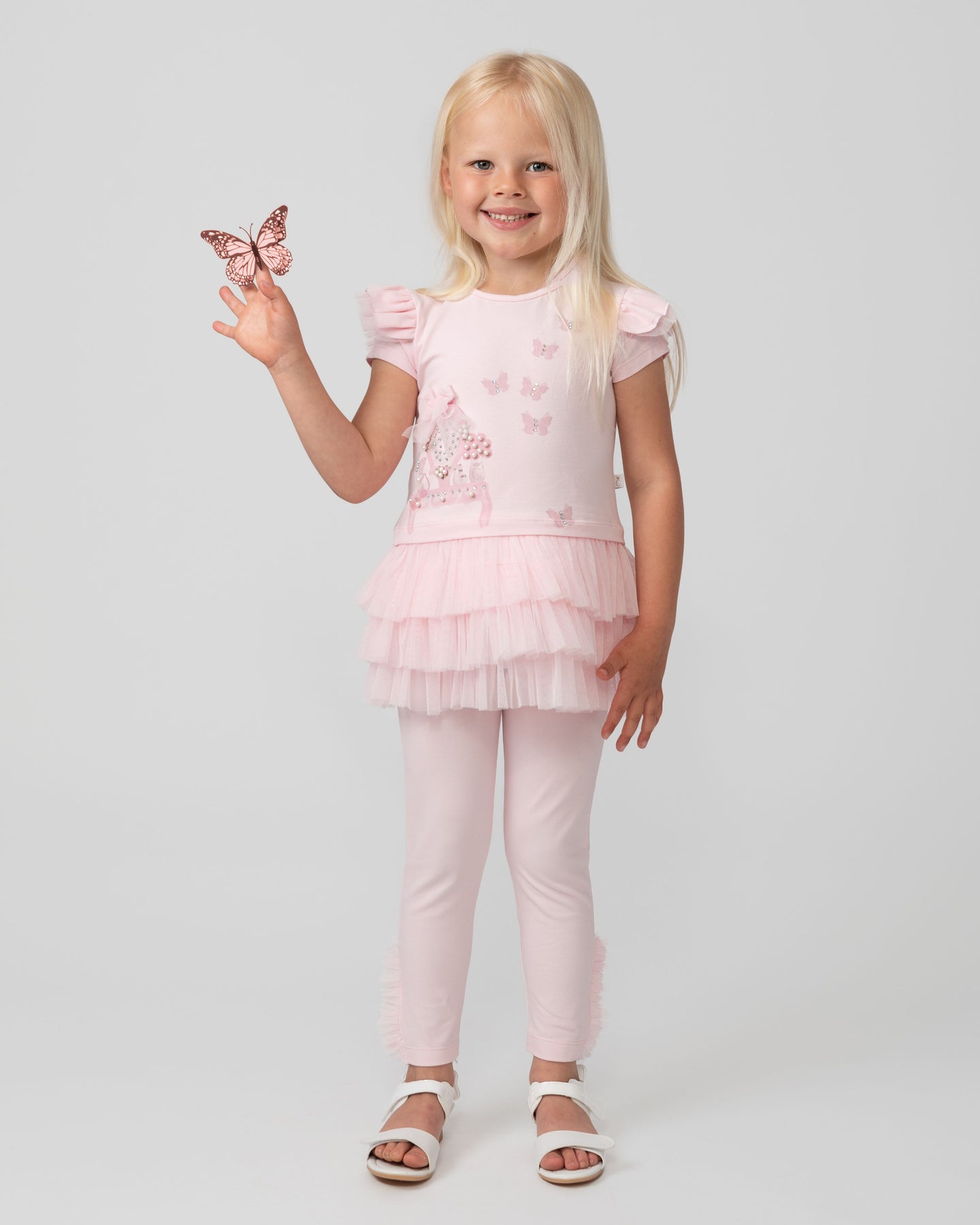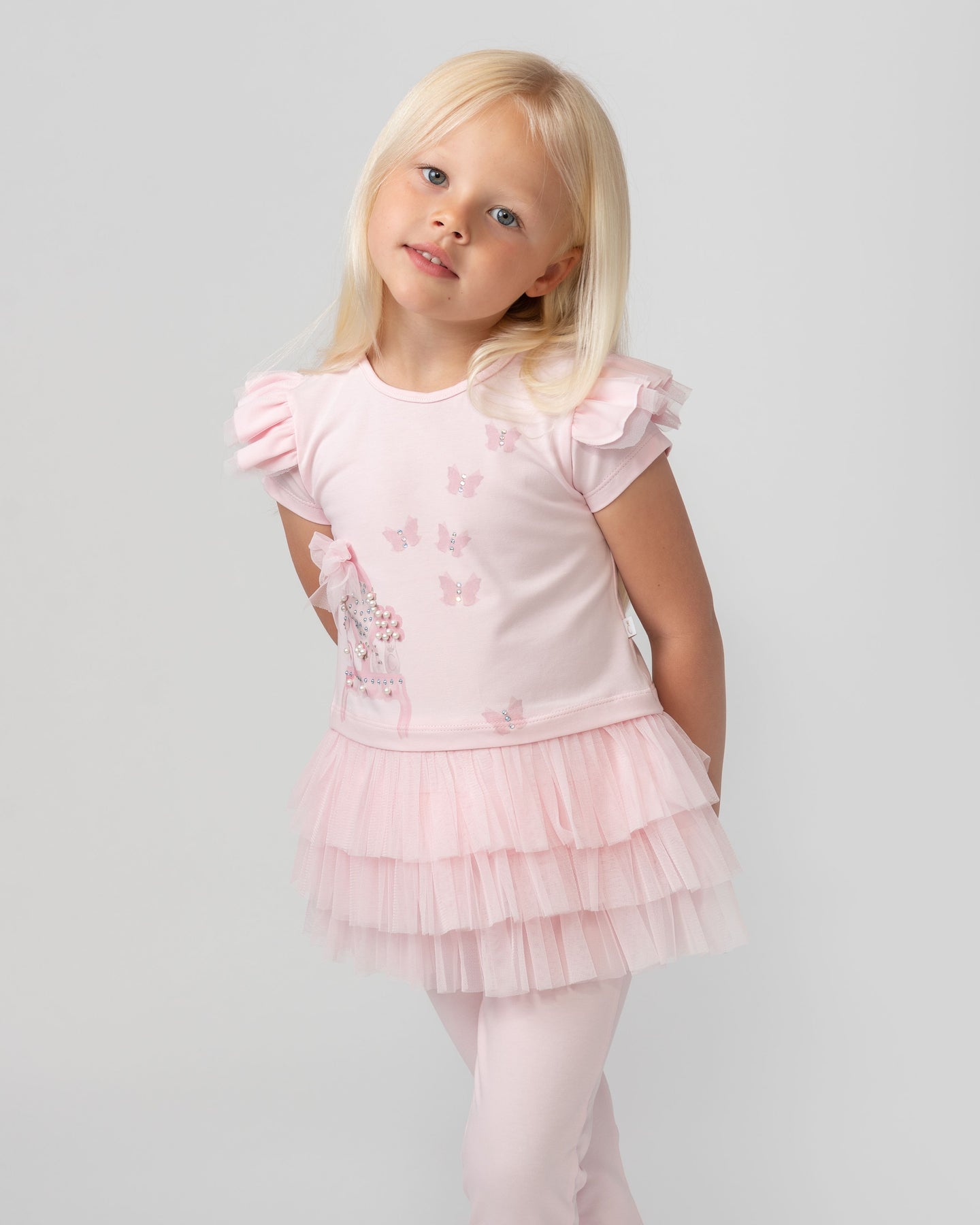 Girls pink tunic and leggings outfit set by Caramelo Kids, made in soft and stretchy cotton jersey. The top has a layered tulle skirt, and there are tulle flowers, satin bows and diamanté on the front. The long length leggings have tulle ruffles on the ankles.
