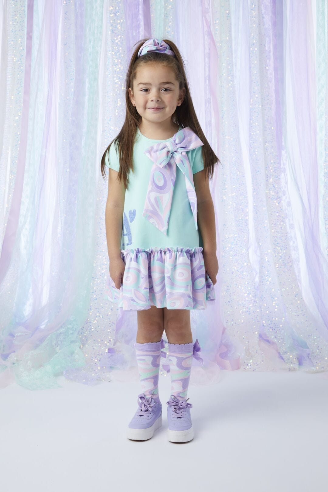 A Dee dress with contrasting popping pastel print peplum and large bow finished with sequin logo artwork on front.