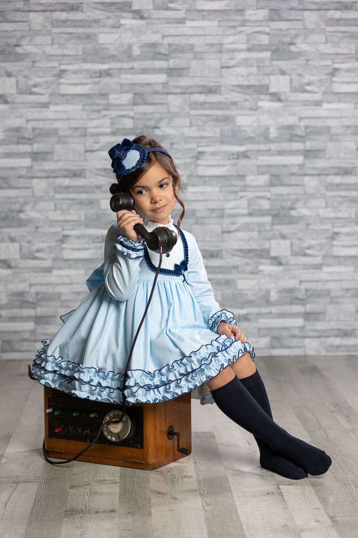 Abuela Tata dress in blue and navy is both stylish and functional, with a beautiful bow back and convenient button fastening.