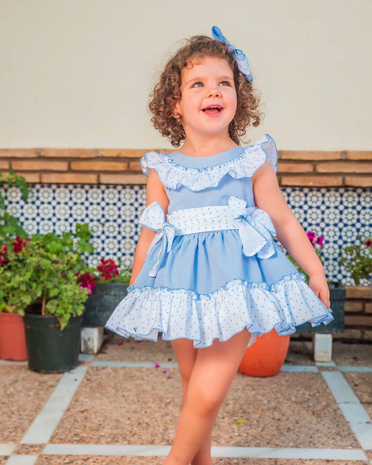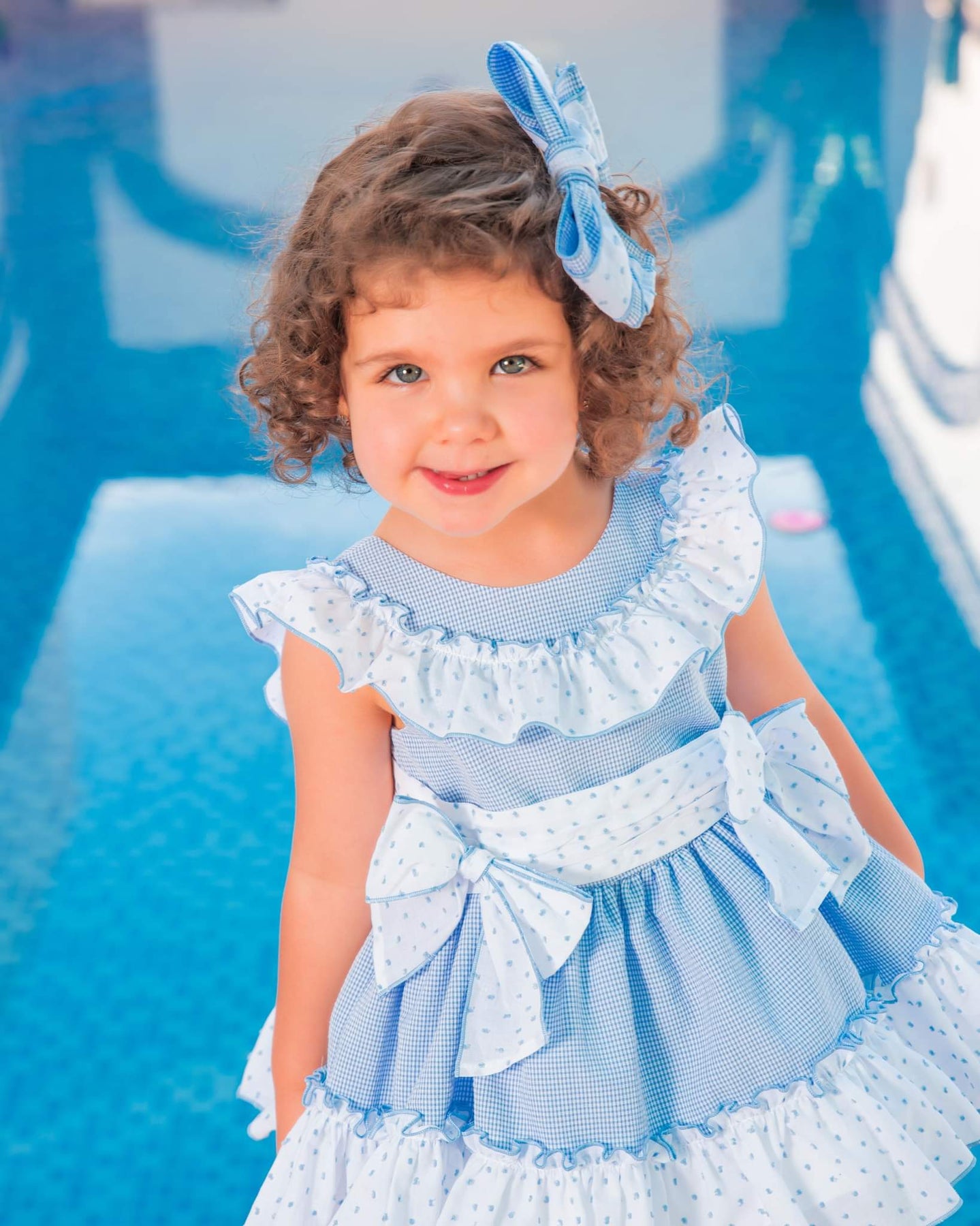 This Babine Blue & White Gingham Dress is perfect for special occasions. It features a classic blue and white gingham print, bows along the waist and a cut-out back. Crafted from soft cotton, it offers both comfort and style.