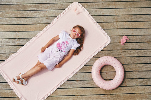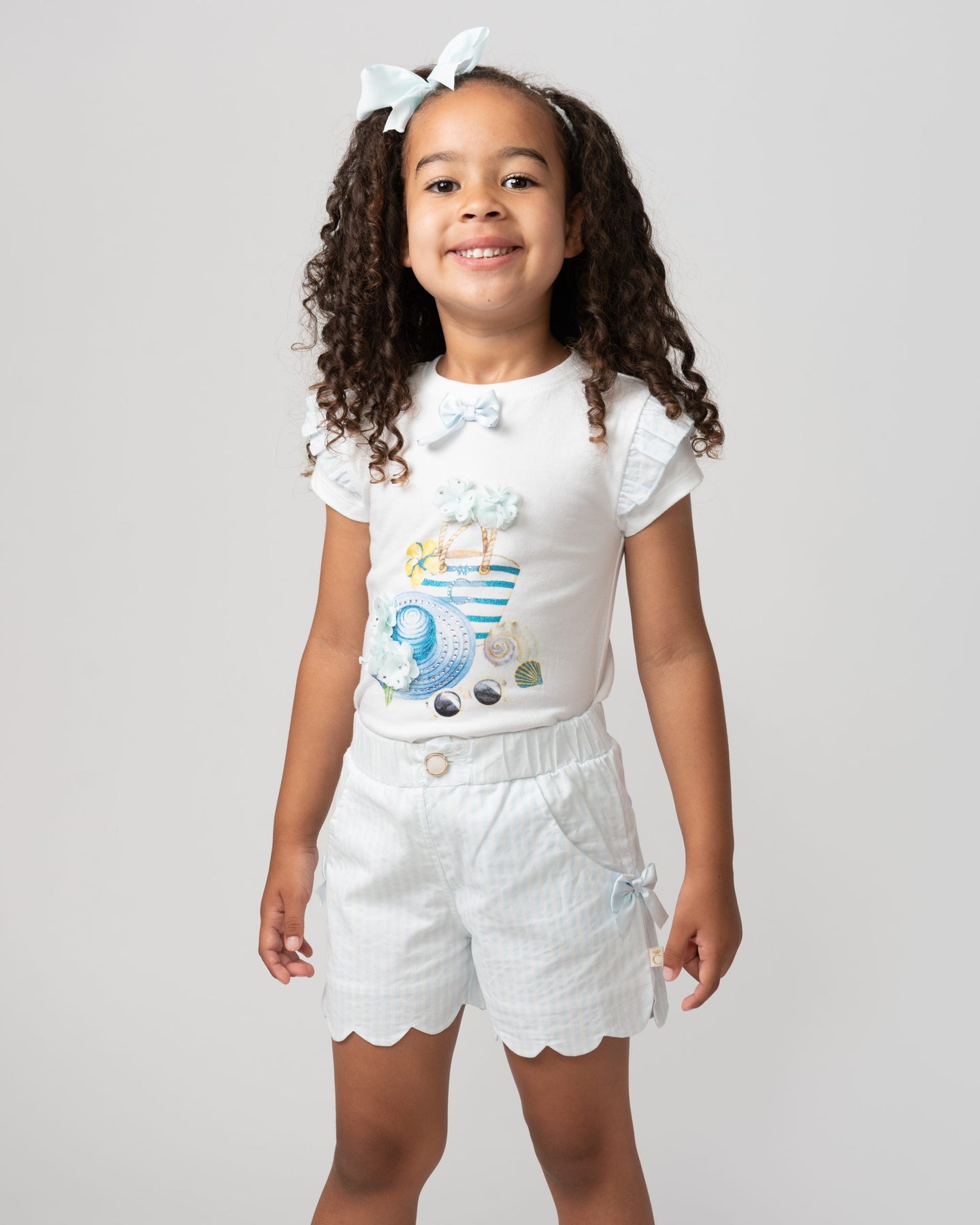 Caramelo Kids pretty 2 piece short set of short sleeve cotton jersey top with handbag print decorated with diamante and pearls on the front and ruffles on the shoulders, comes with pretty white and pink stripe scalloped leg shorts - an elasticated waistband ensures its an easy fit. Perfect holiday outfit.