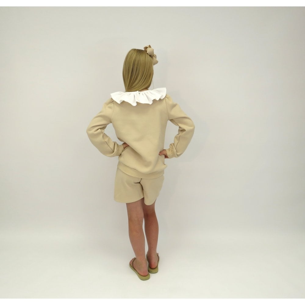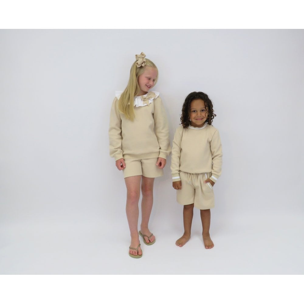 A girls beautiful frilly collar jumper teamed up with relaxed fit shorts, these are great for traveling on holiday in or for the days where its just a little bit chilly outside.