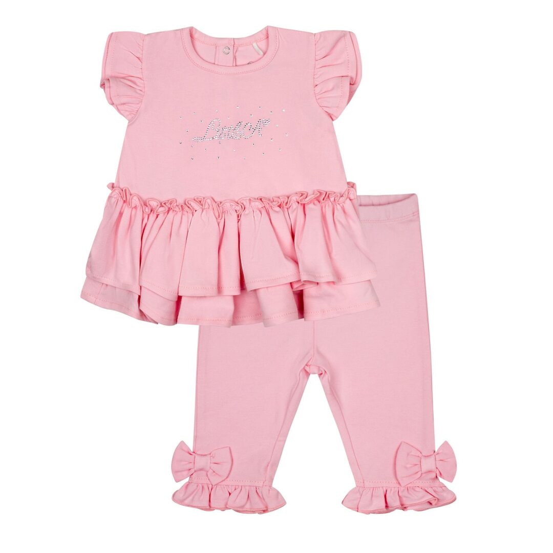 The Little A Pink Fairy Pastel Hearts "JACKIE" Frill Leggings Set is a gorgeous addition to any little girl's wardrobe. Made of soft cotton jersey, this set features a double peplum frill on top and frill finish on the sleeves and leggings. Complete with bow details and diamante Little A branding, it's the perfect combination of comfort and style. Don't forget to check out other matching items from the A Dee Little A Pastel Hearts Collection.