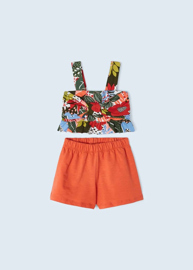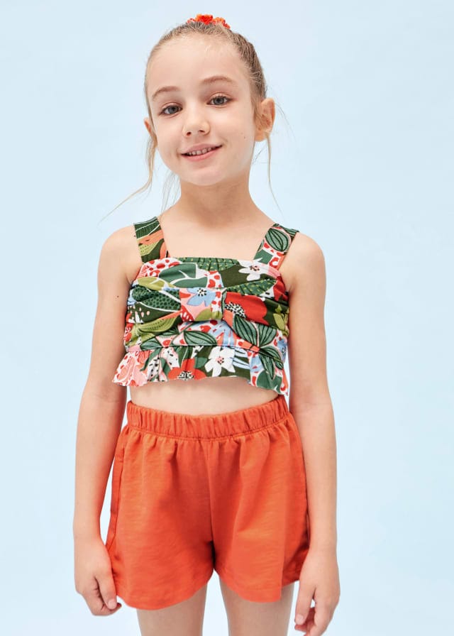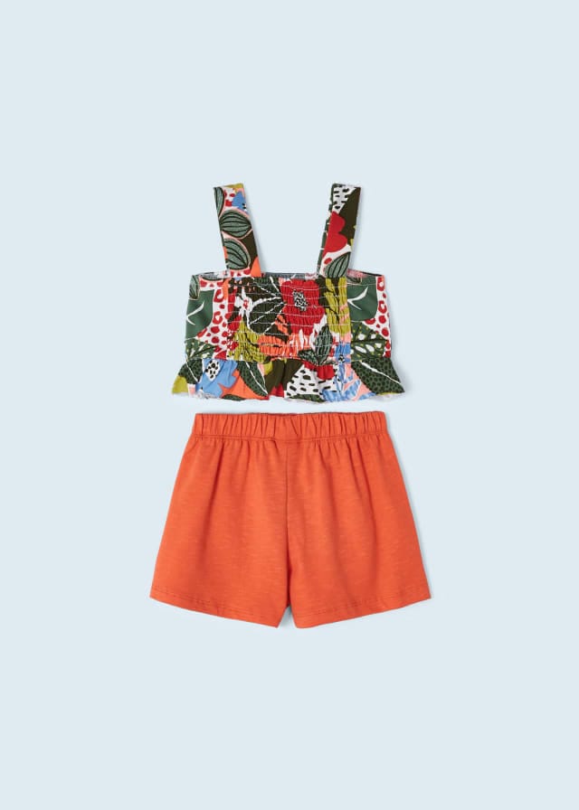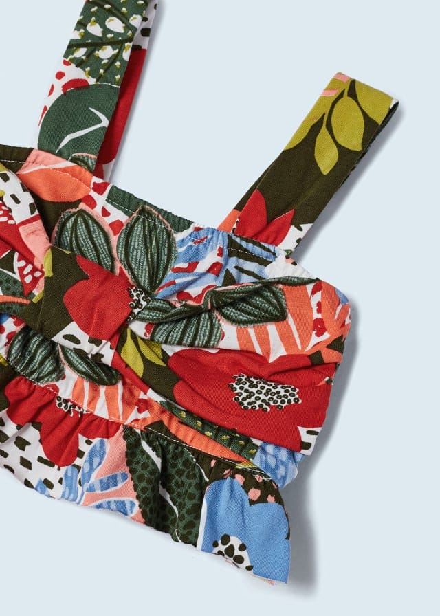 This girls' two-piece shorts set from Mayoral is crafted with ECOFRIENDS garment, offering a 100% sustainable cotton design. The top includes adjustable braces, while the shorts feature elastic waistband for an adjustable fit. A beautiful floral pattern rounds out this environmentally-friendly set.