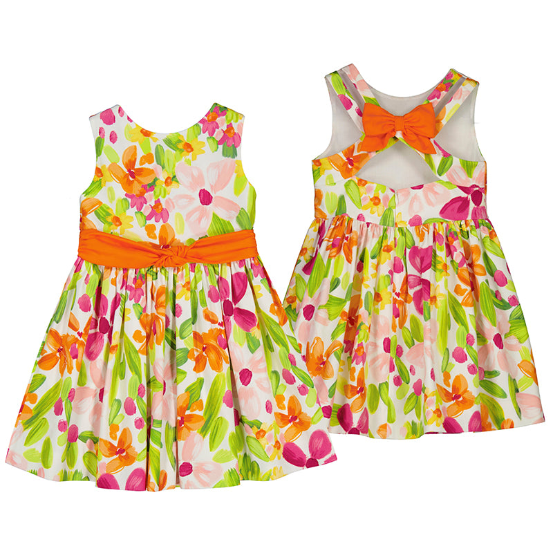Mayoral Girls Floral Print Bow Back Dress! This sleeveless dress features a vibrant floral print in shades of oranges, pinks, and greens, while the orange satin bow and sash add an extra special touch to the back and waist.