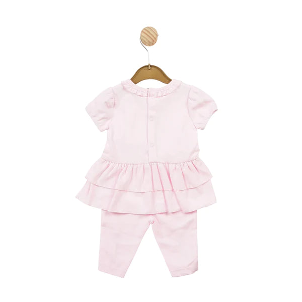 Mintini Pink Ballerina Slippers Dress & Leggings Set! This adorable set features a tiered top with a ruffle collar, embroidered ballerina slippers, and two pretty bows. With a popper fastening at the back, dressing your child has never been easier. Perfect for special occasions.