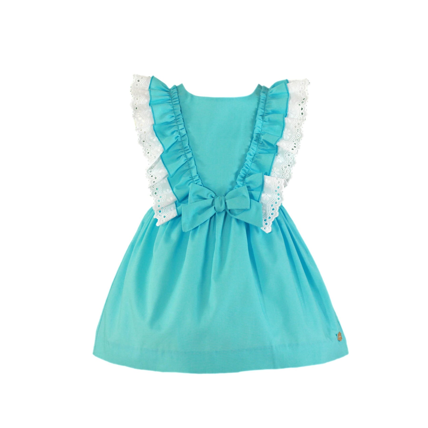 Miranda girls turquoise dress with white frill broderie-anglaise detail and bow.