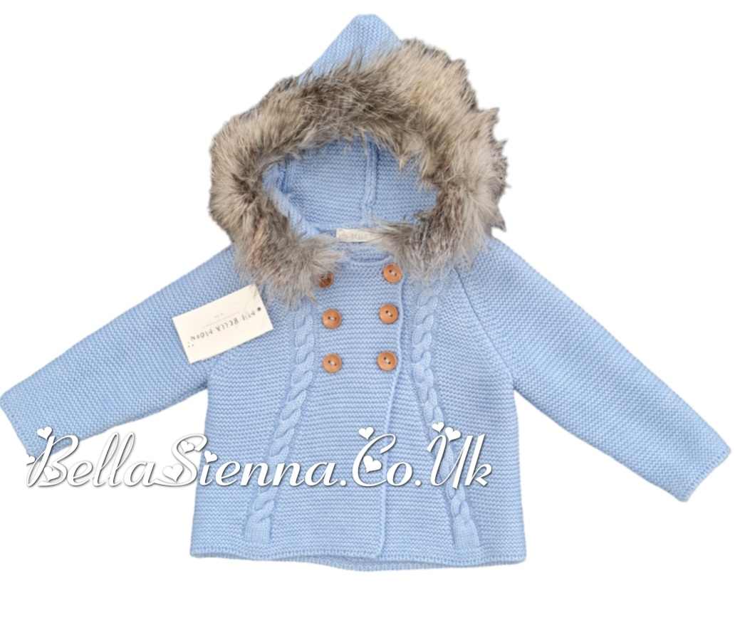 My Bella Moon Fine Knitted Jacket. This stylish cable knit jacket in blue features a luxurious fur hood and double breasted button fastening. Stay warm and with this must-have to your winter wardrobe.