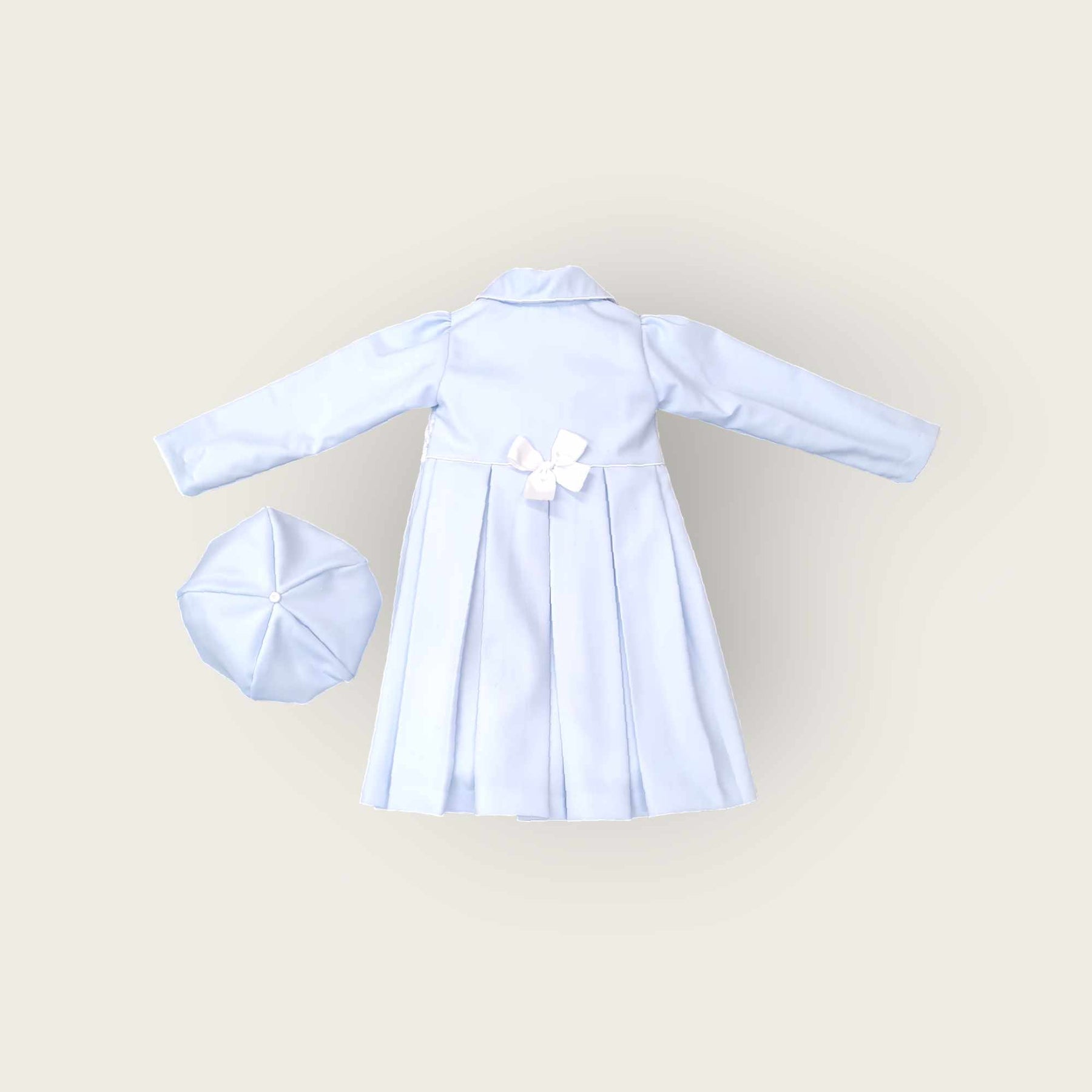 Pretty Originals Pale Blue Smocked Autumn/Winter Coat And Beret. Exclusive to Bella Sienna, this set features a traditional blue and white trim coat with a peter pan collar, pretty smocking and embroidered flowers, and pleats. Complete the ensemble with the cute blue beret with a bow.