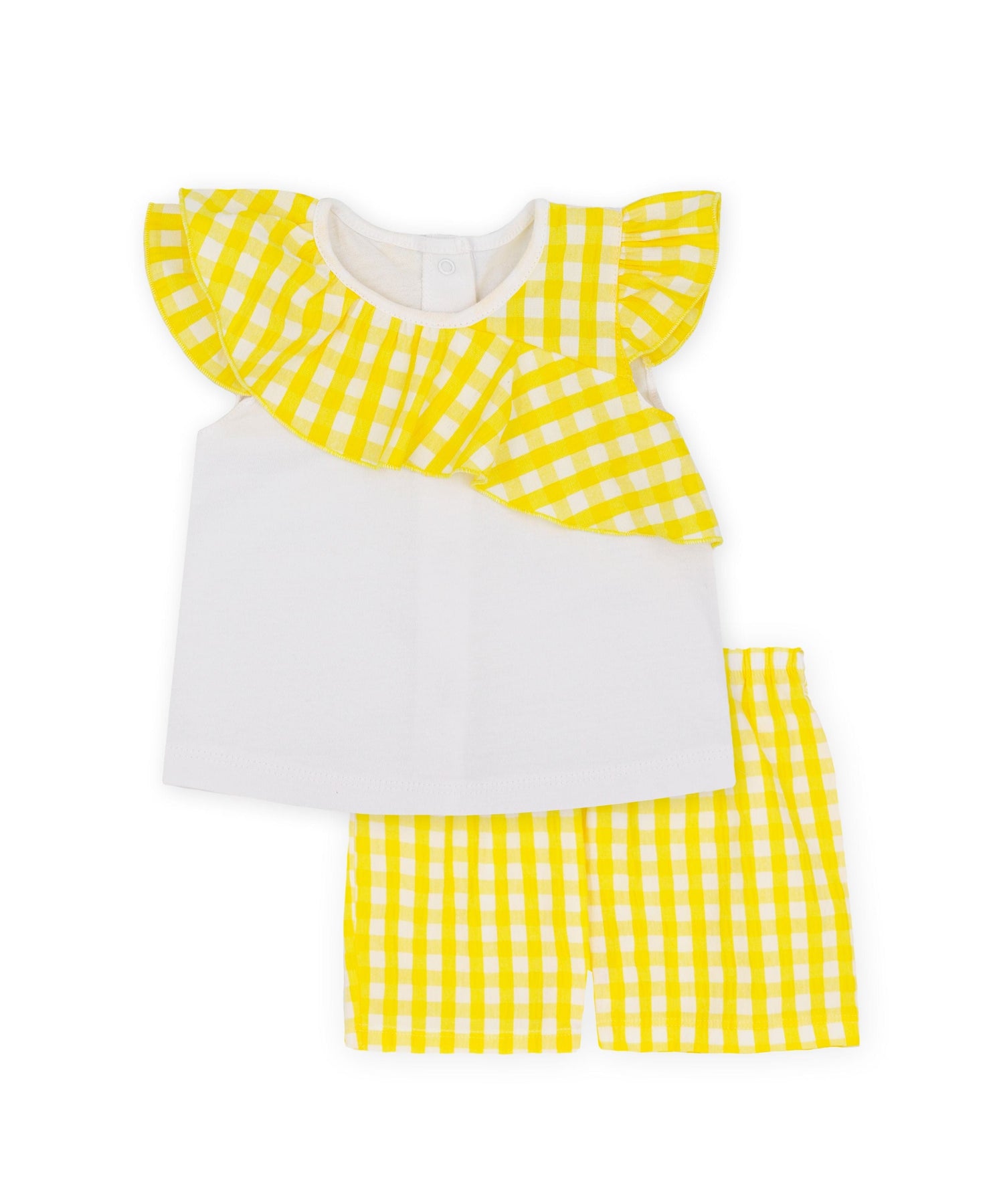 Rapife Girls Yellow & White Two Piece Shorts Set is ideal for your little girl's day out! The set includes a sleeveless yellow check blouse and white shorts, crafted from comfortable and breathable fabric.