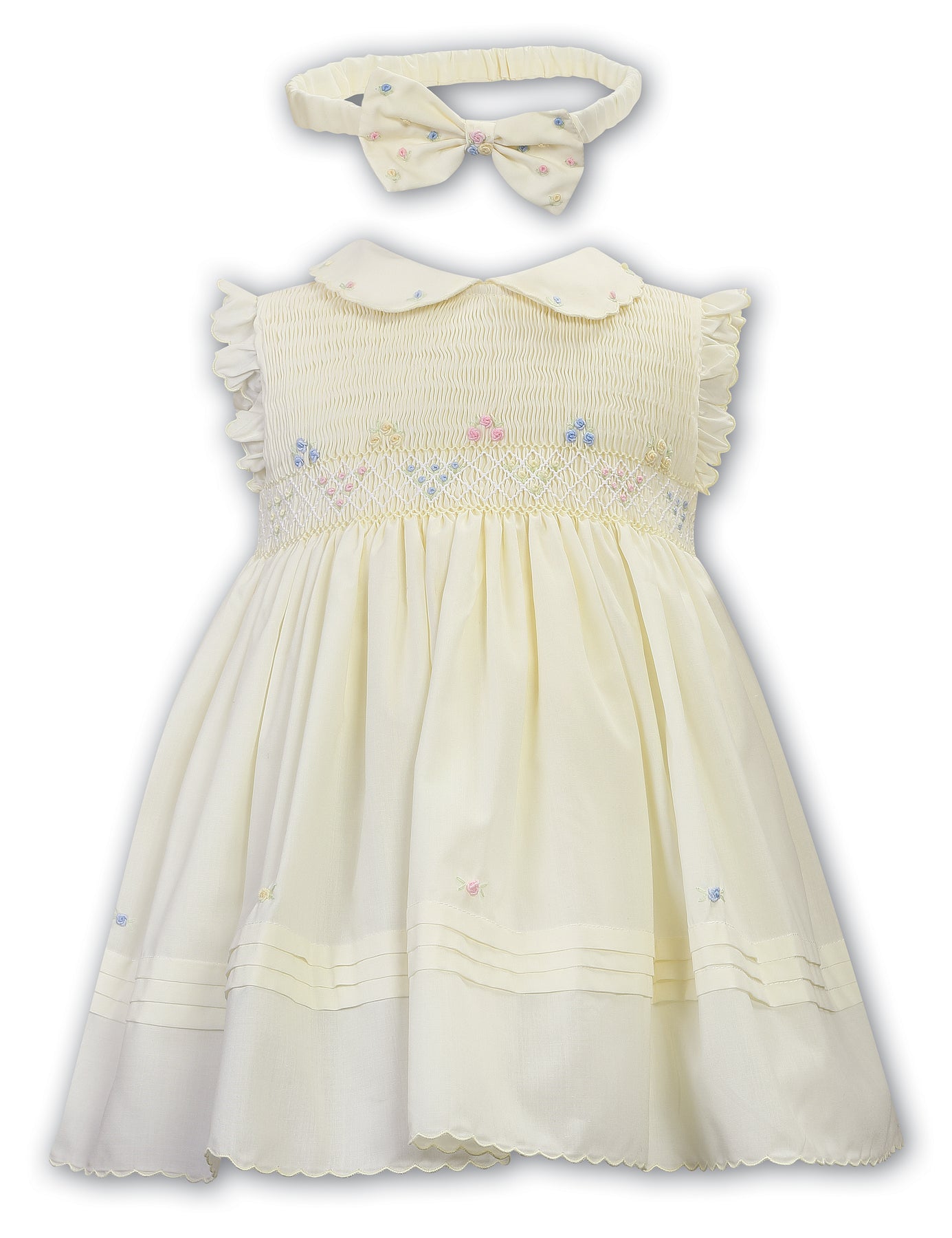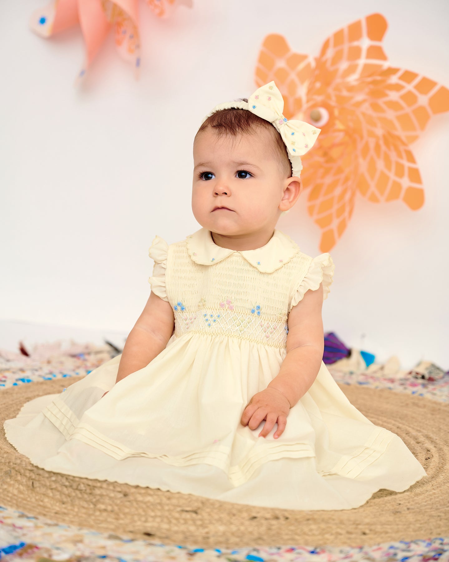 The most elegant dress for your little princess, designed in lemon with highlights of pastel pink and blue. The dress is intricately hand smocked, lined and fastens at the back with pearlescent buttons. A pretty frill detailing at the neckline and shoulder, this sleeveless dress is complete with a matching headband accessory.