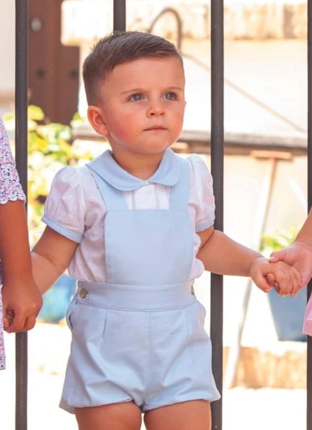 The Dbb Collection Boys Baby Blue & White Set – 9705 is perfect for any occasion. The set includes a white shirt with a baby blue peter pan collar, and dungarees with button fastening and elasticated legs. It's the perfect special outfit for your little one.