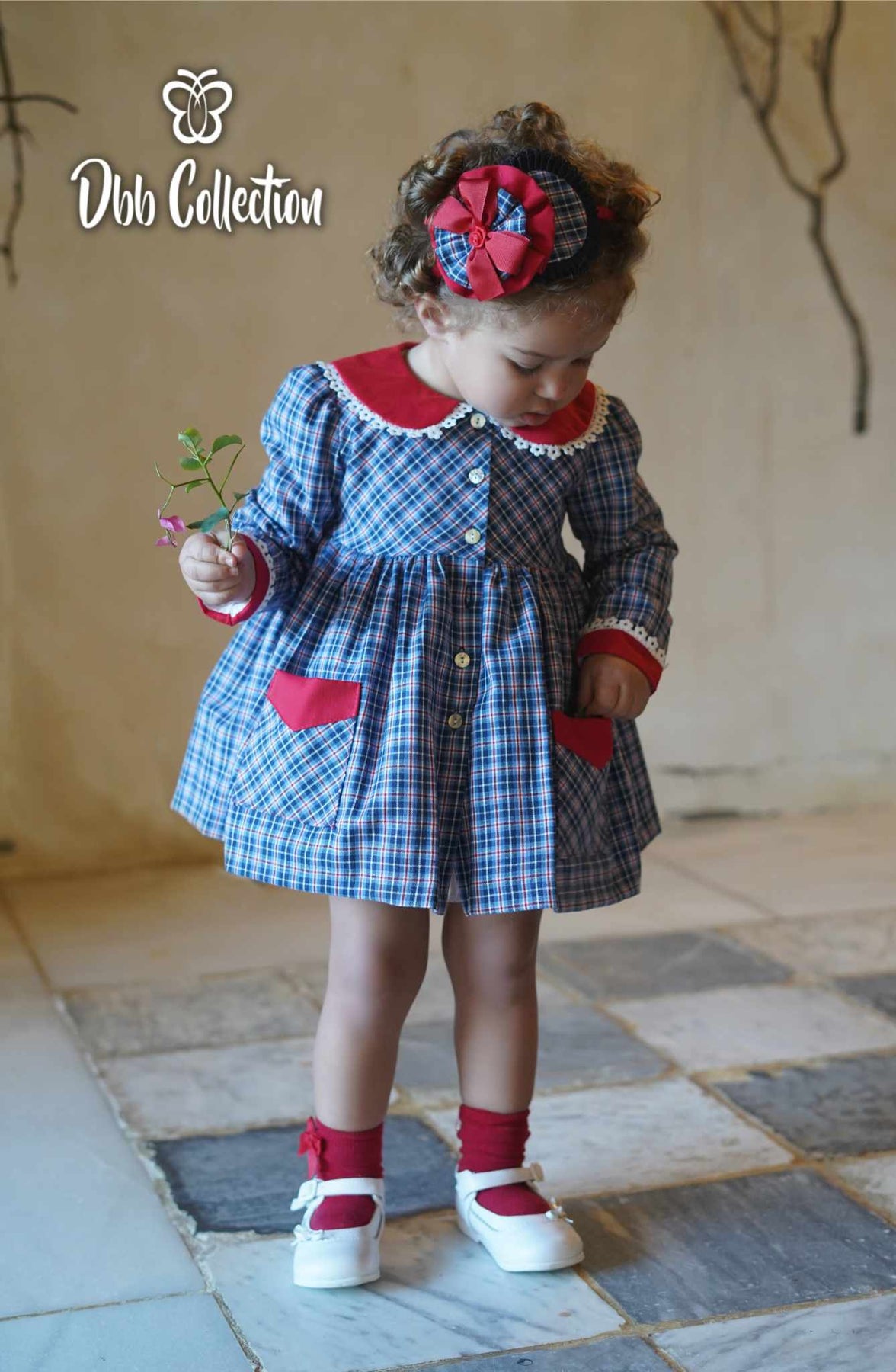 DBB Collection for girls. This stylish dress features a classic check pattern in blue and red, complemented by a matching headpiece. The dress is designed with a peter pan collar and button fastening and pockets to the front.
