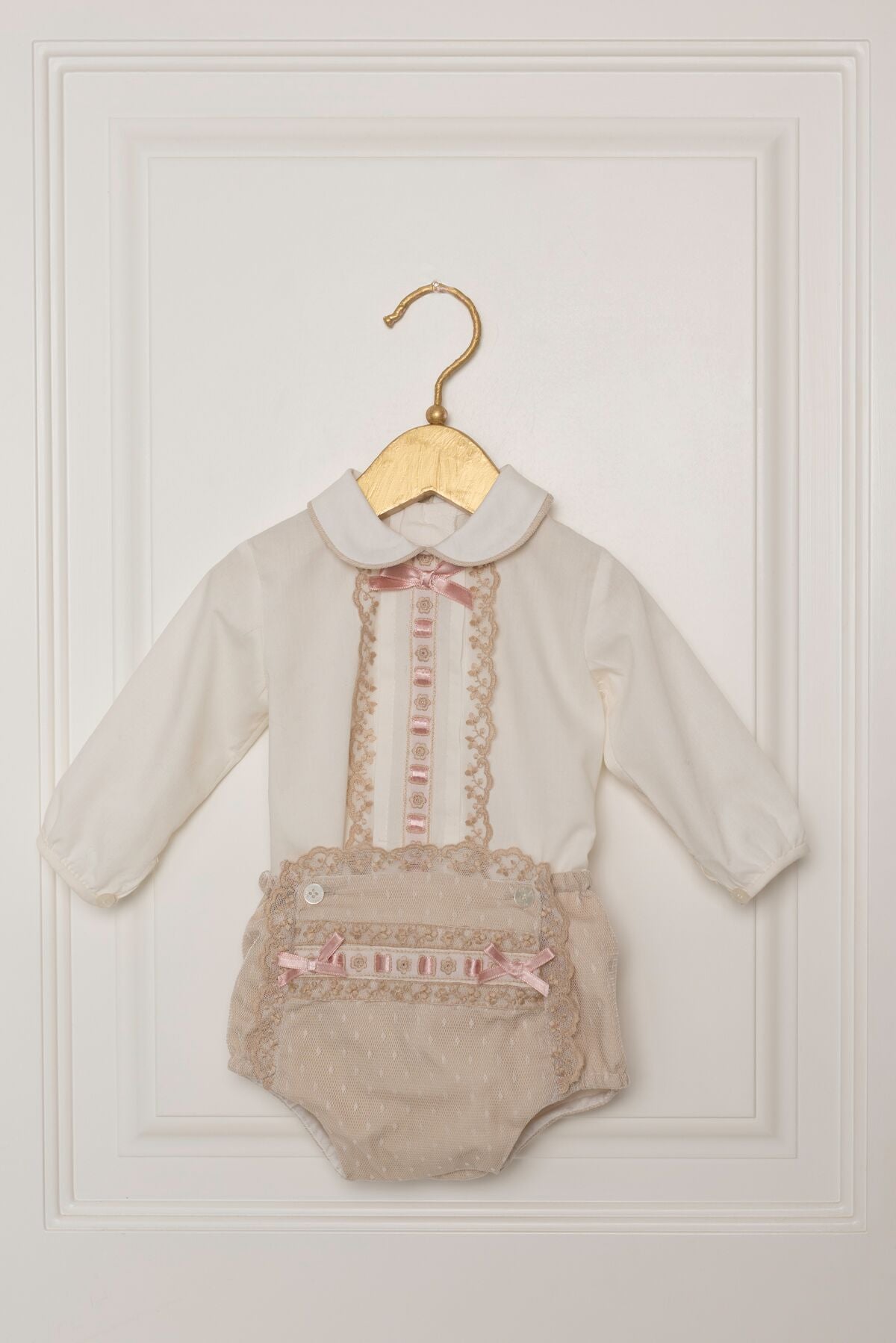 This beautiful Dolce Petit Top & Jam pants Set combines an ivory, camel and dusky pink colour, with intricate lace and ribbons details. The top features a button fastening for secure fit. Perfect for special occasions.