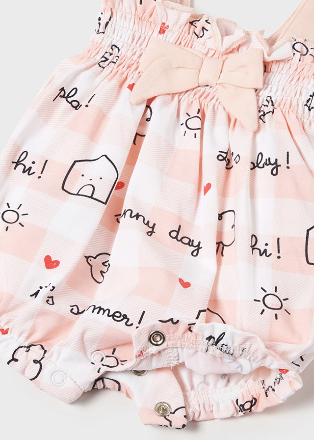 Bodysuit romper with pretty matching headband for newborn girl. Made from soft elasticated cotton fabric. Sleeveless bodysuit romper. Snap-buttons to fasten. Decorative bow applique. Patterned design. Original headband. This is a perfect accessory to complete this pretty look.