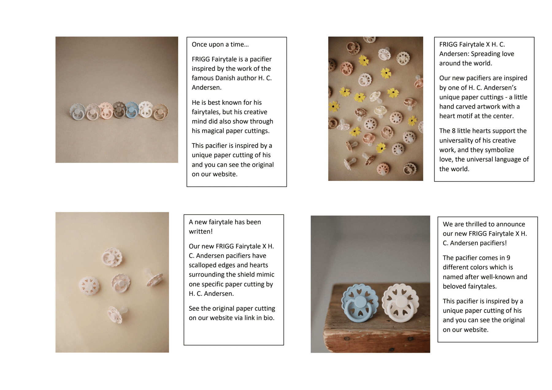 FRIGG Fairytale with scalloped edges and hearts surrounding the shield mimic one specific paper cutting by H. C. Andersen. The 8 little hearts support the universality of his creative work, and they symbolize love, the universal language of the world. This is the inspiration that lies within the FRIGG Fairytale pacifiers: They are approachable for everyone because love is a language, everyone can speak and understand.