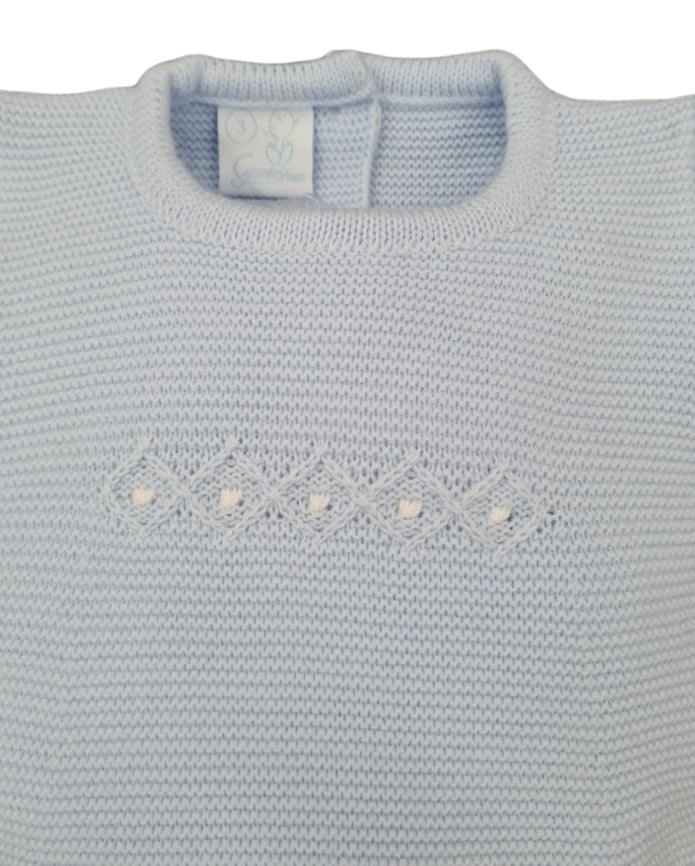 Granlei knitted shortie with rounded collar, long sleeves with ribbed edge and fancy knit bodice, ribbed legs with pearl buttons and 3 pearl buttons at the back of the neck with ribbed panel across the shoulders. Presented in Granlei gift box.