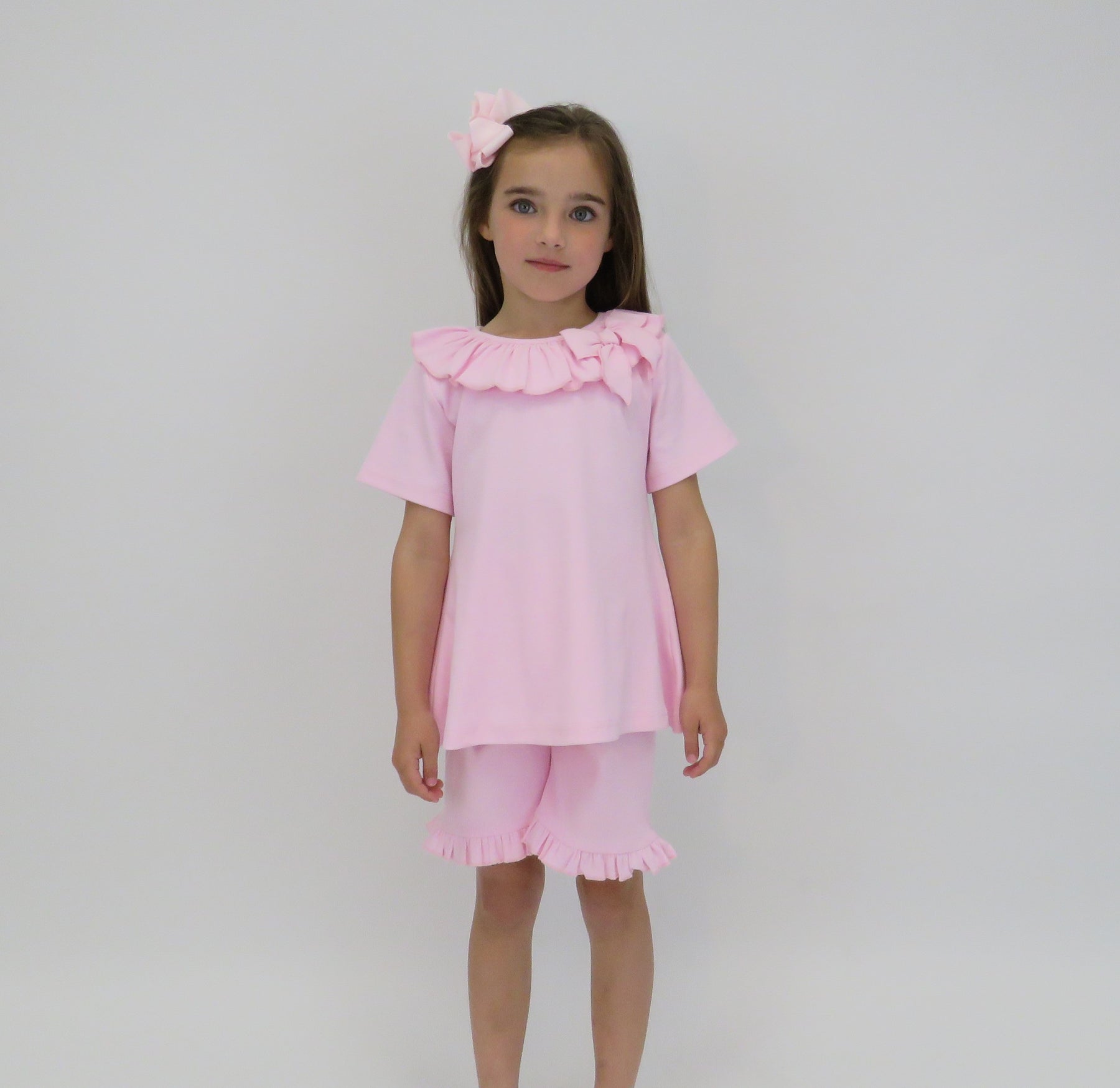 Our Billie Girls 2 piece tracksuit lounge set is dressy but still durable and comfortable., this set comes with a short sleeve top finished with a frilly collar and a fabric bow, this set comes with straight fit frilly edged shorts.