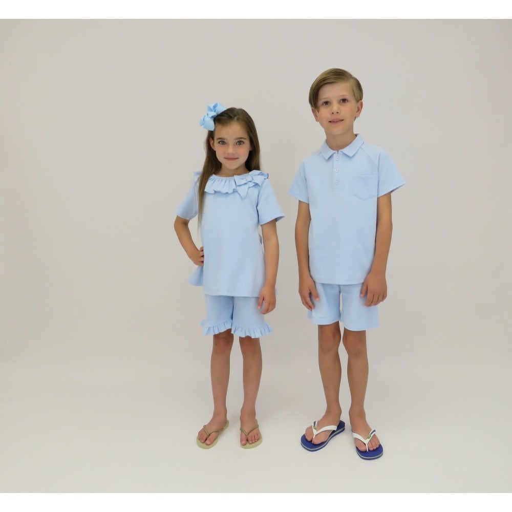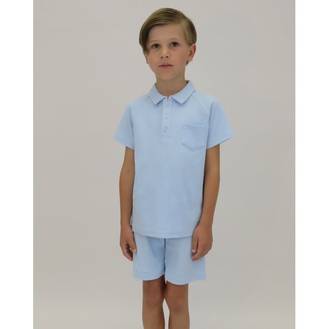 A boys ribbed material polo top with matching shorts, this is a smart slim fit boys set.