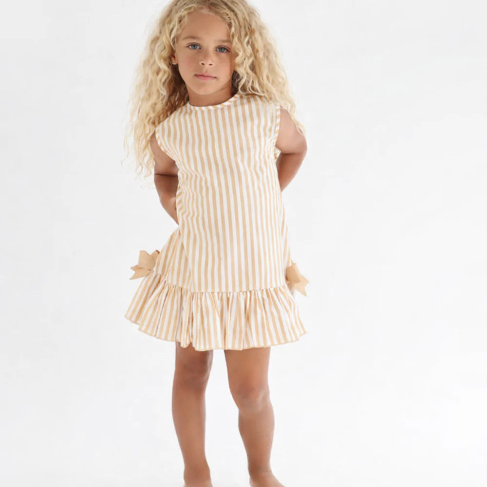 Harris Kids "Grace" Girls Beige Striped Frilly Bow Dress