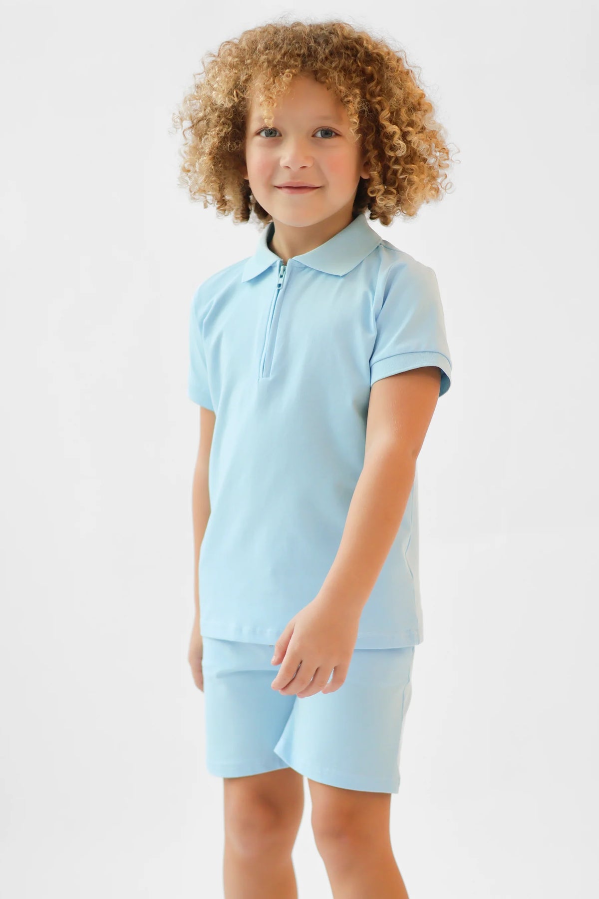 A boys cotton polo top with a zip up front, it comes with matching shorts to make the perfect co-ord set.