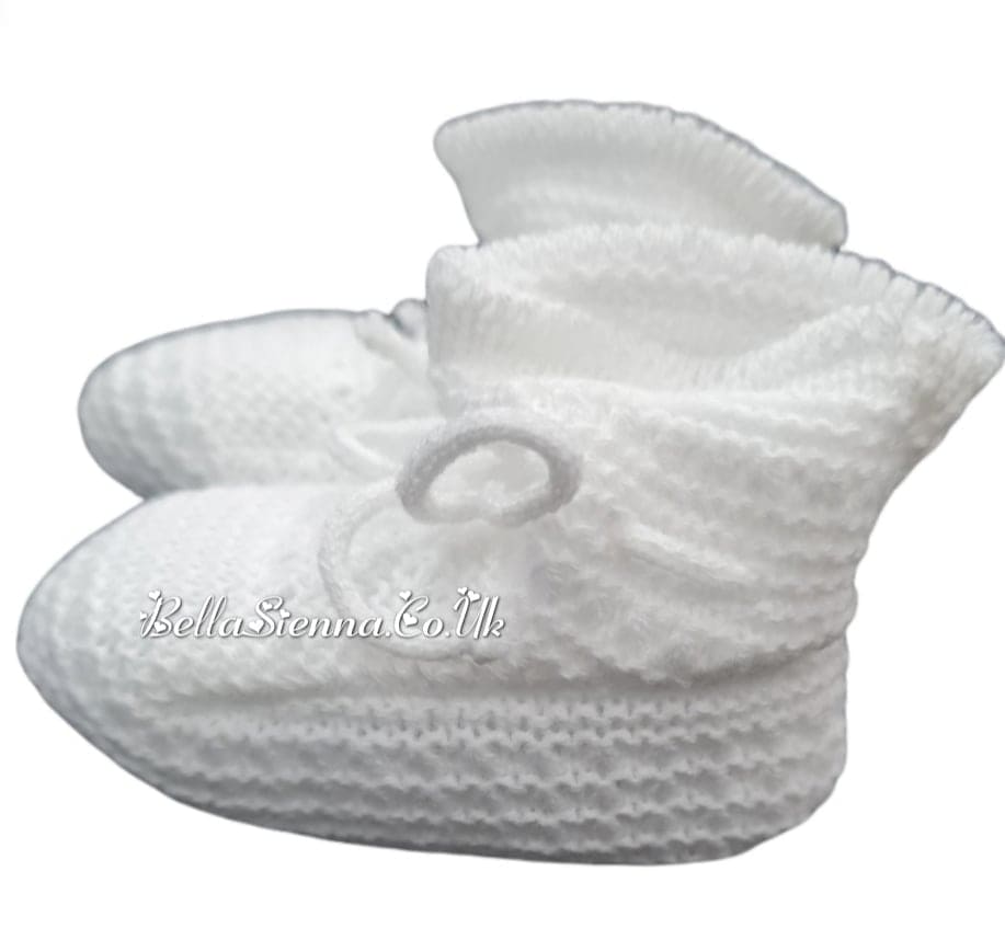 A lovely four piece set for baby boys or girls from Mac Ilusion. The set comes in a white and is unisex . The top features classic knit, The top fastens to the back with matching white buttons. The pants in the set are in the same colour with incorporated button fastening either side for comfort. The set is finished with a beautiful bonnet and matching booties that has the same knit detailing.