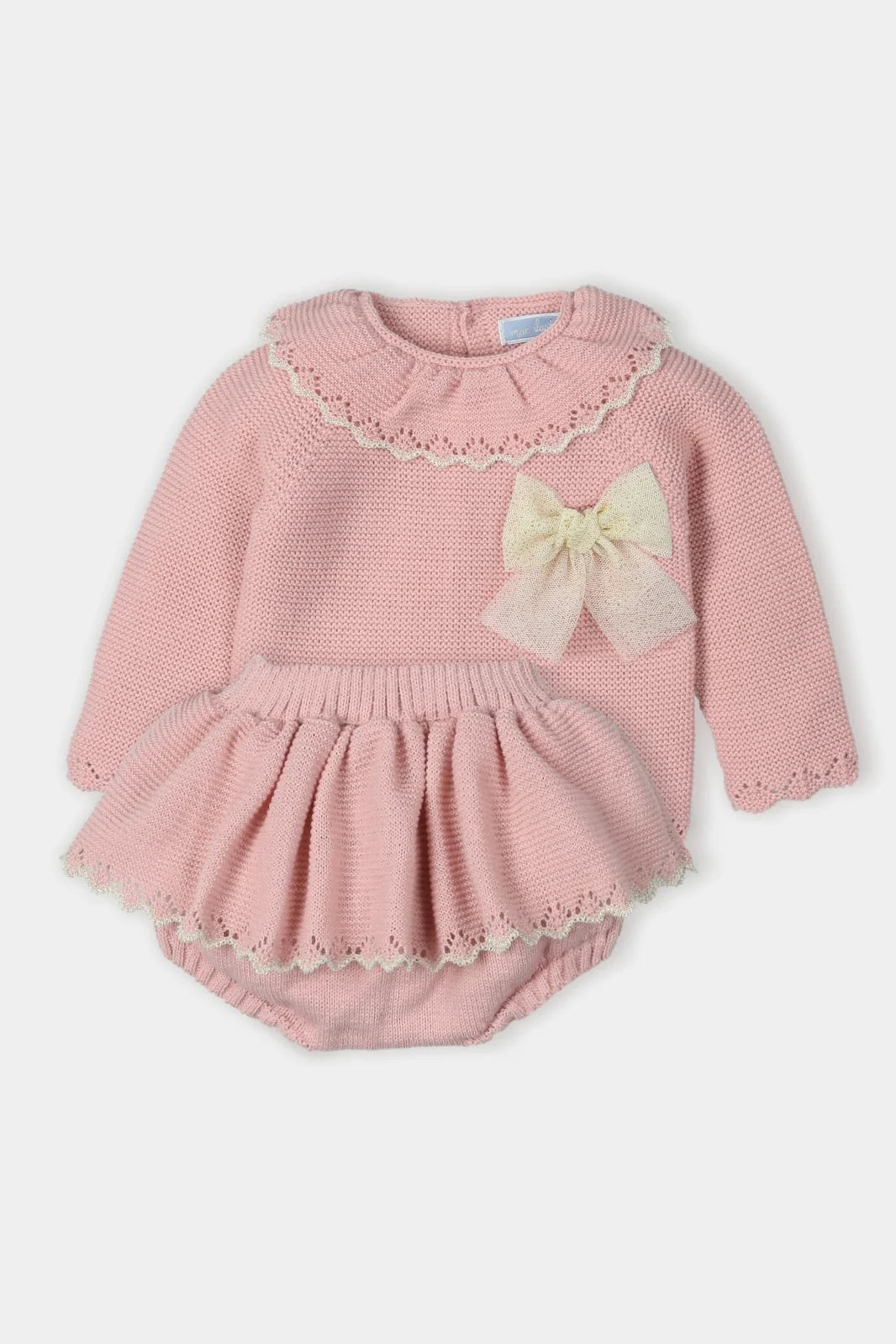 Introducing this adorable Mac ilusion's Baby Pink Top and Bloomers, perfect for your baby girl. Made from knitted fabric and designed with a sweet ruffle collar and sparkly golden tulle bow, this pink long sleeve top and bloomers combo will have your little one looking like a princess.