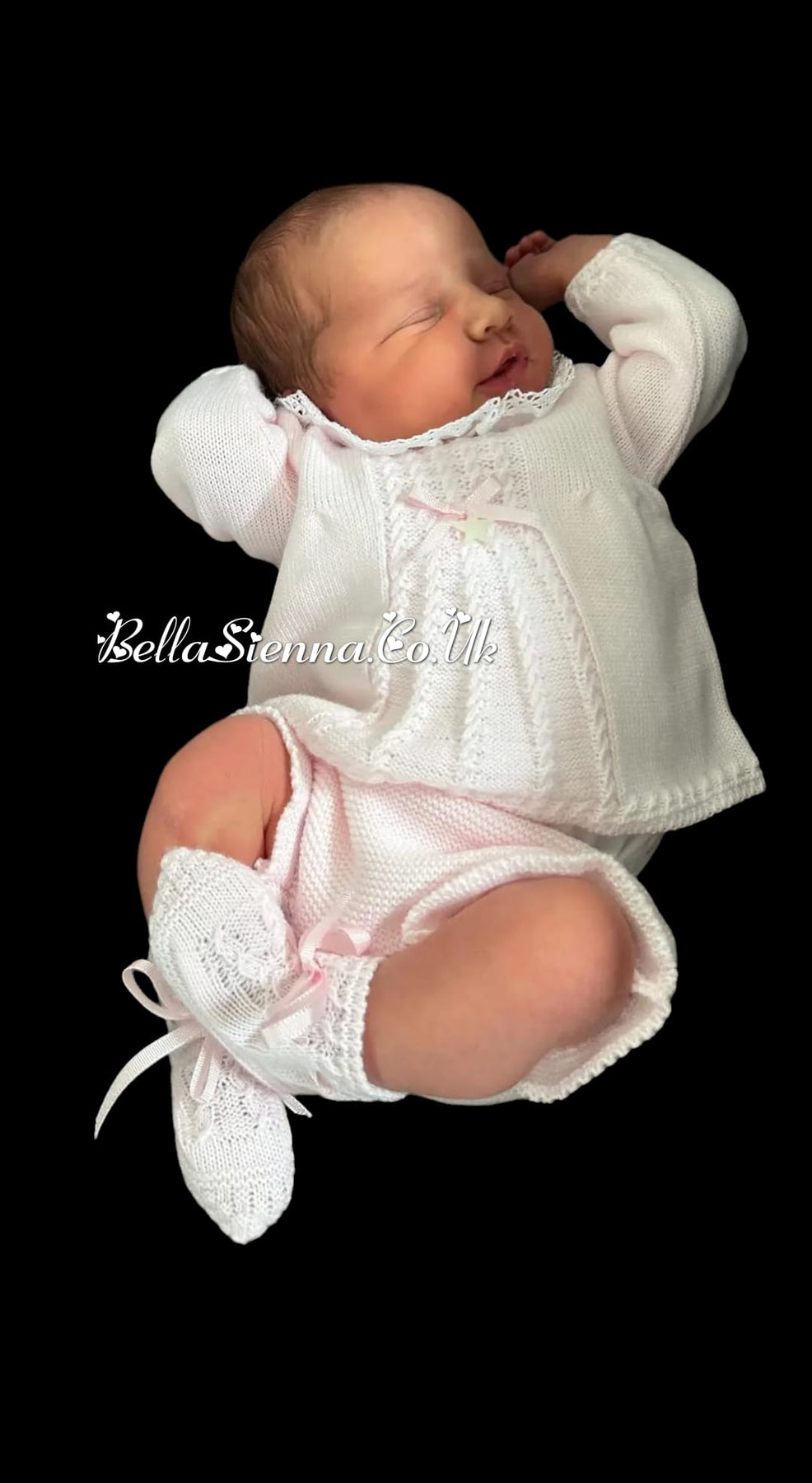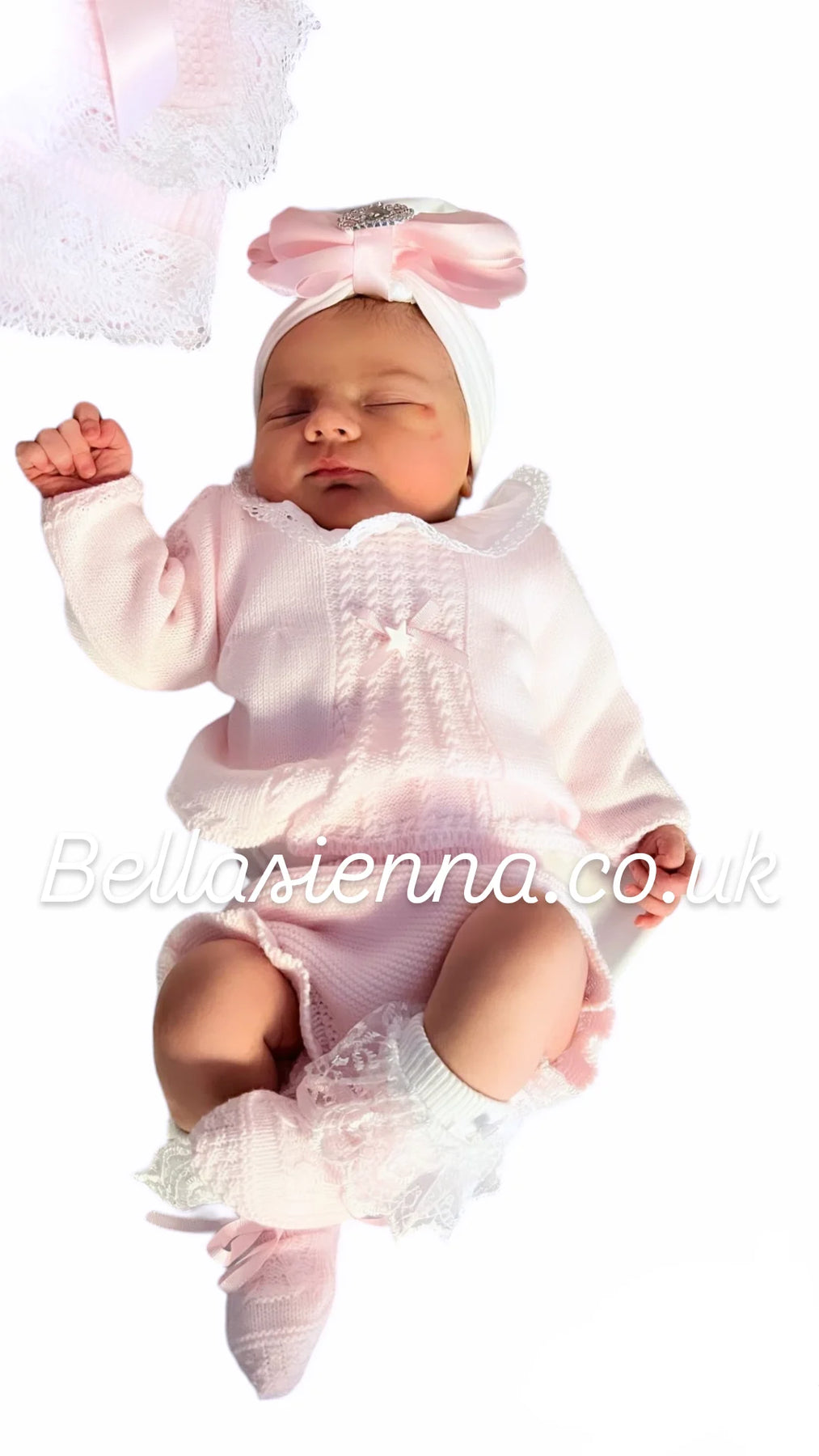 Mac Ilusion pink knitted jam pants and top with a white ruffle collar, small bow and branded star badge, detailing down the front and sweet bow. Featuring matching pink knitted booties and bonnet.
