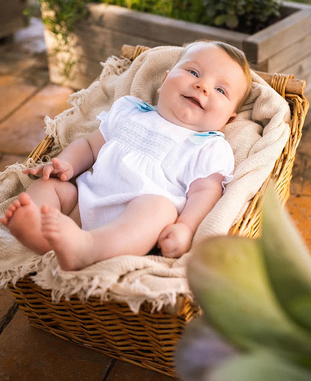 Adorable Mac ilusion Unisex Baby Special Smocked Romper features delicate blue bows and convenient button fastenings at the back and between the legs. Perfect for any special occasion, this romper makes changing a breeze while keeping your little one looking adorable.