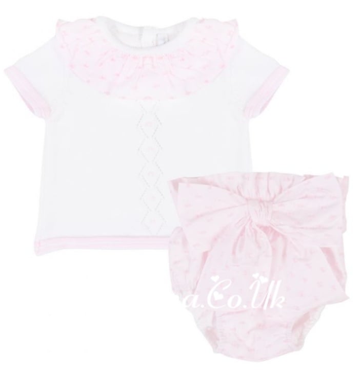 A stunning white and pink jam pant set for baby girls by Martin Aranda. The white top is made in soft and lightweight cotton. It has a pretty pink ruffle neckline. The pink poplin pants have a big bow on the front, and an elasticated waistband and legs for comfort.