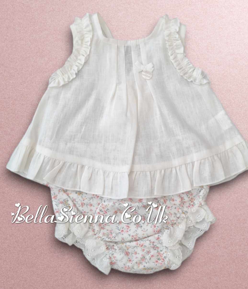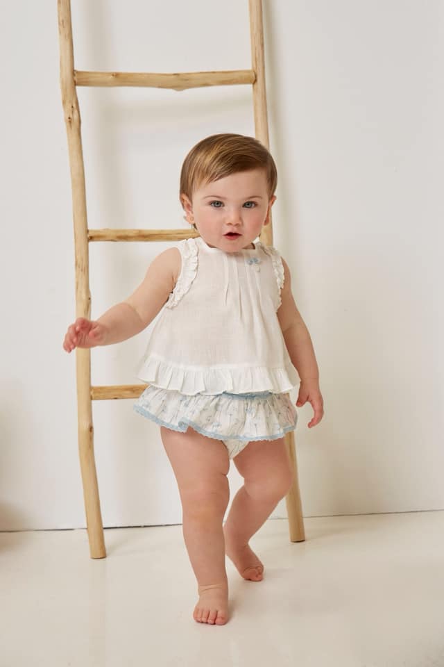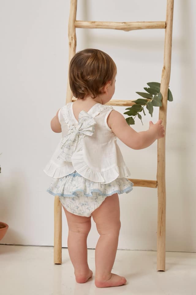 A stunning ivory and floral jam pant set for baby girls by Martin Aranda. The ivory blouse is made in soft and lightweight cotton. It has a pretty ruffling on the arms. The floral pants have ruffles all around, and an elasticated waistband and legs for comfort.
