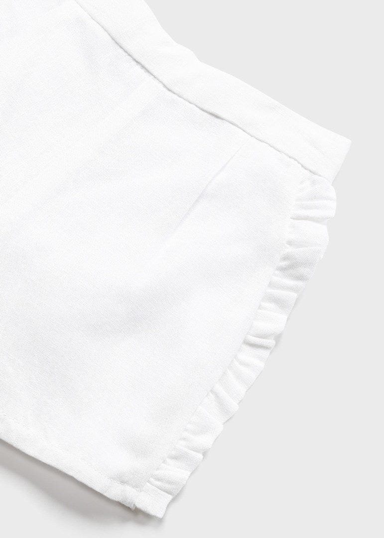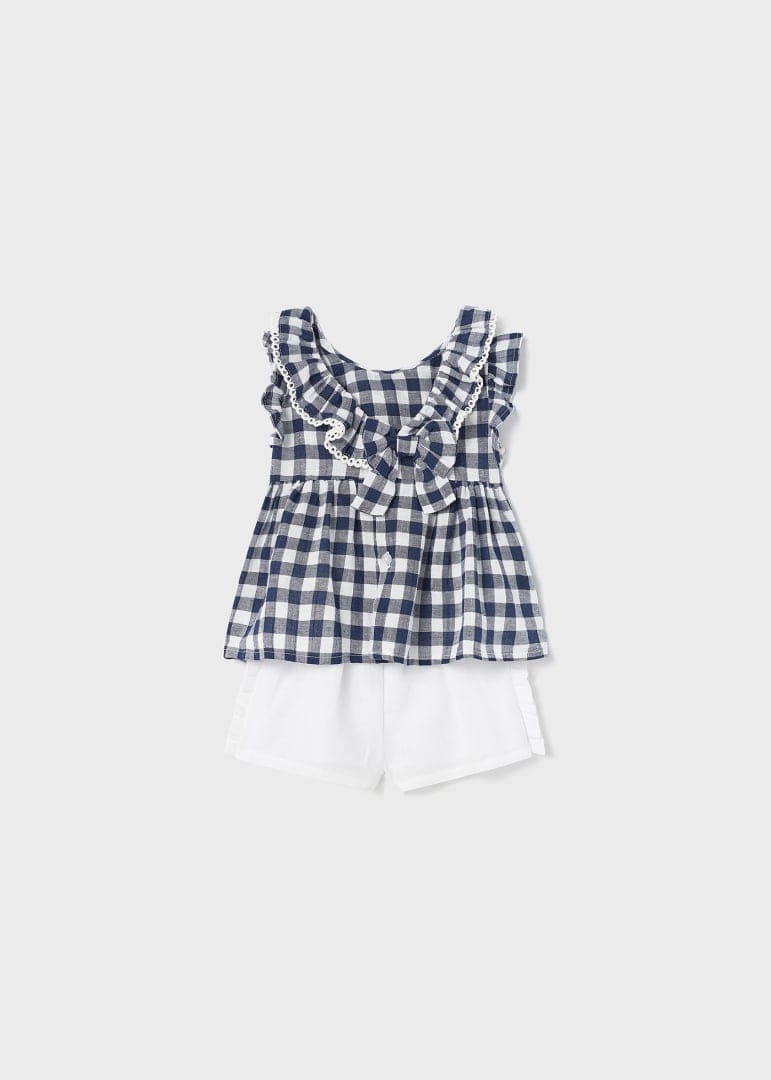 Matching two piece set for baby made up of a long, loose shirt and shorts. Fresh and contemporary fabric with linen.