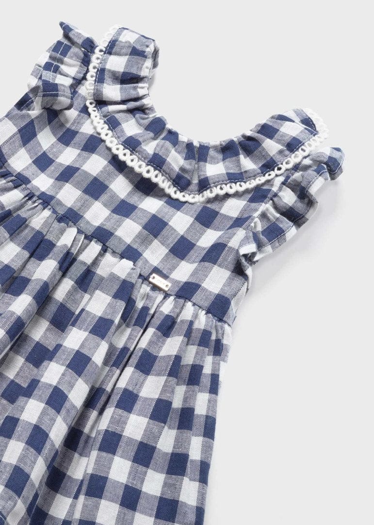 Sleeveless blouse for baby. Button fastenings down the back to allow the garment to be put on and taken off easily. Decorative elements: bow applique, decorative ruffles. Patterned design.