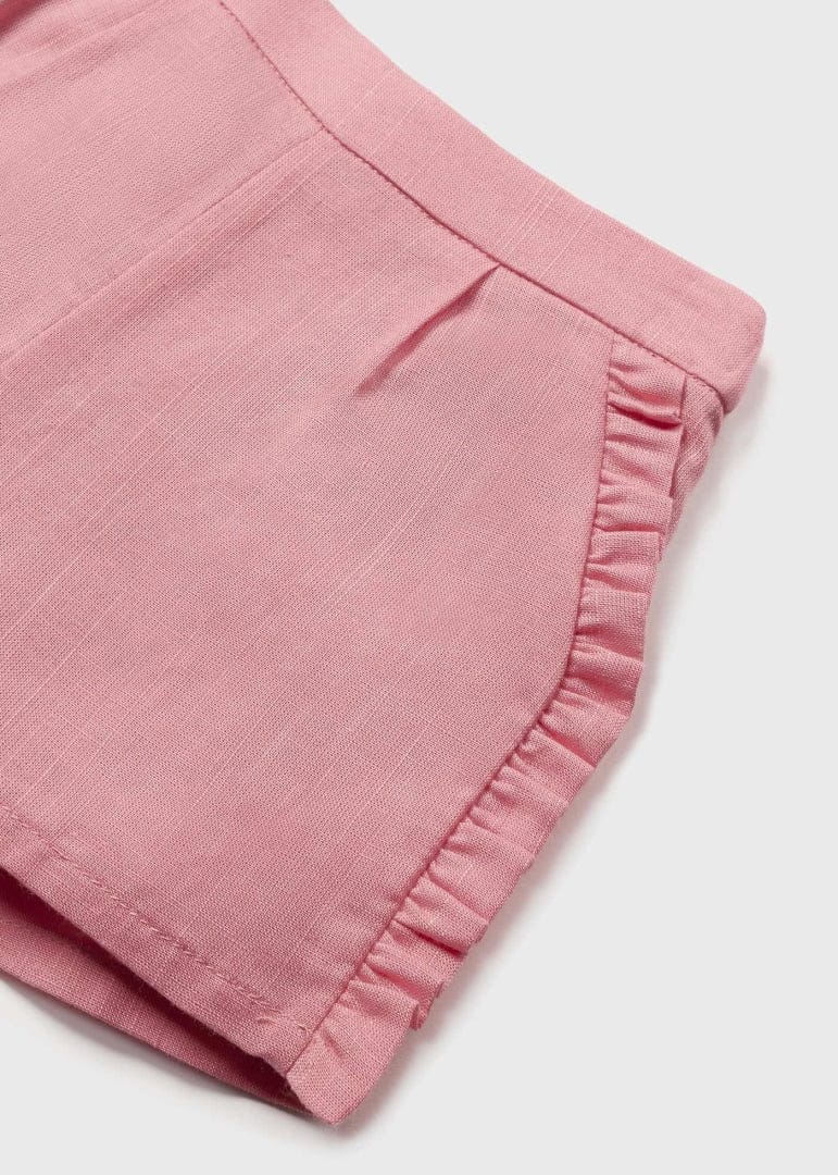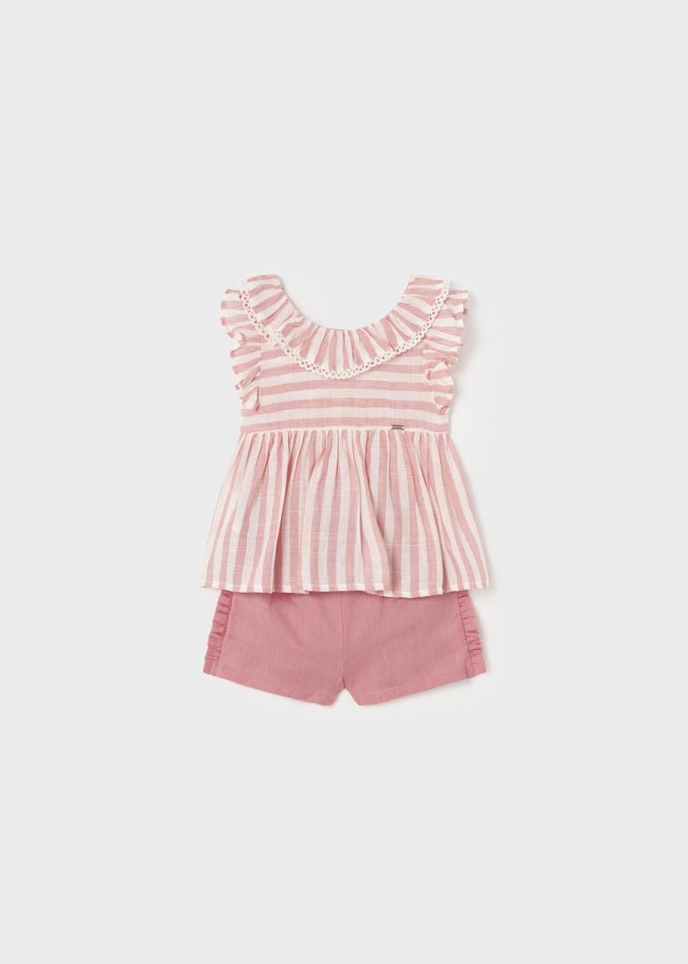 Matching peachy pink two piece set for baby made up of a long, loose shirt and shorts. Fresh and contemporary fabric with linen.