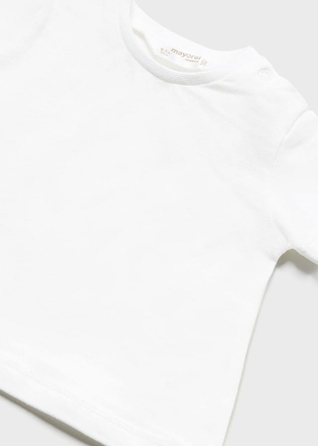Short sleeved T-shirt for newborn. Round neckline. Snap-button fastenings on the shoulder to allow the garment to be put on easily. Made from soft elasticated cotton fabric.