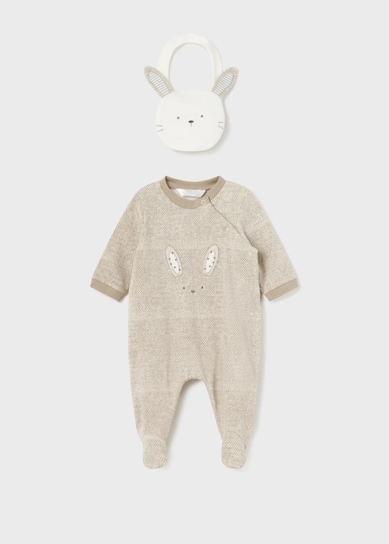 Long sleeved romper for newborn. Side fastening with press studs. Snap button fastening at crotch for easy dressing. The larger sizes of this model (12 and 18 months) have a non-slip sole.