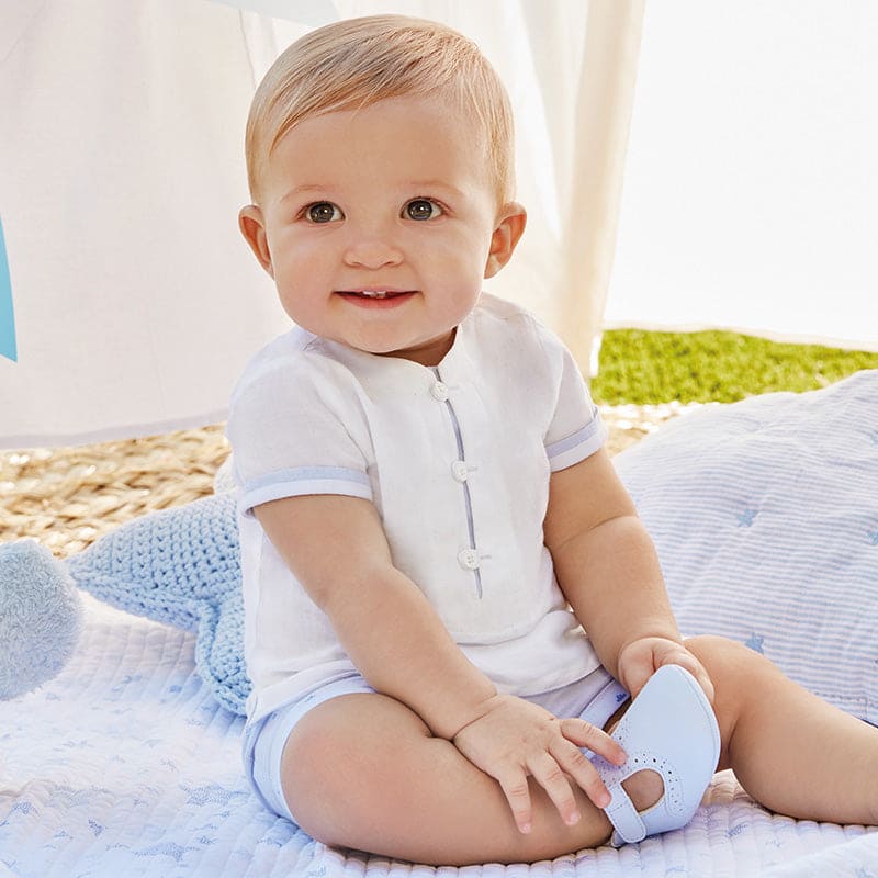 Mayoral Baby Boys Two Piece Shorts Set is perfect for special occasions or daily wear. Featuring a blue shorts with imitation pockets, and a white shirt with rounded collar buttons and down the front, this set is made of 100% cotton for a soft and comfortable fit. Its classic design ensures the perfect combination of style and comfort.