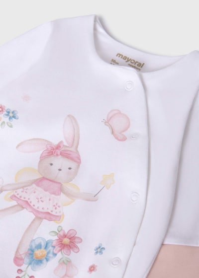 Long sleeve sleepsuit for baby. Side fastening with press studs. Button fastening at the bottom. Patterned design.