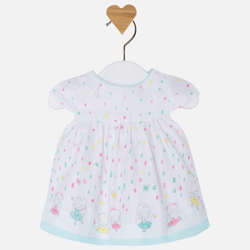 White cotton dress with a gorgeous delicate bright spots in greens, pink and lemons. It has little caped sleeves and fairy print around the bottom of the dress a perfect little summer dress for your princess.