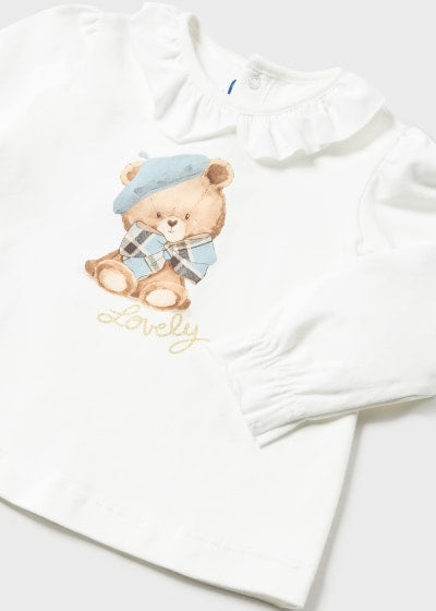 Long sleeved T-shirt with elasticated cuffs for baby. Round neckline with ruffles. Snap button fastening at the back. Decorative elements: design on the front, glitter
