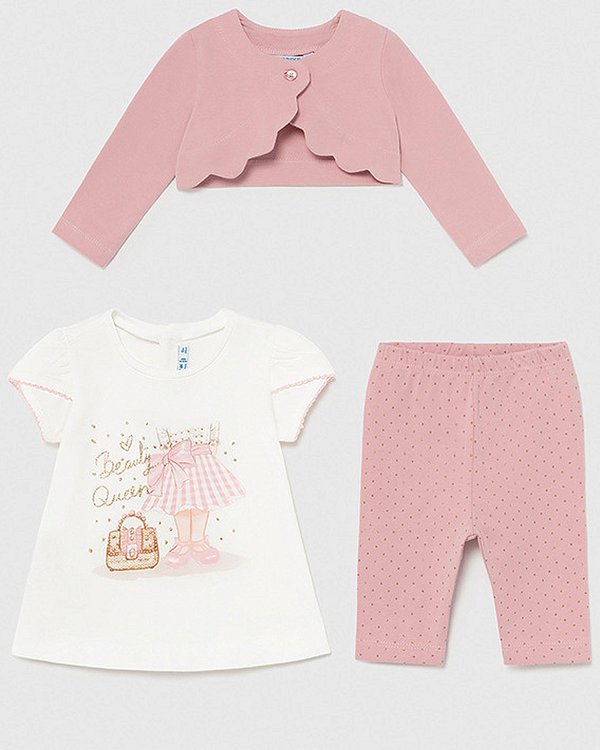 Dress your little girl in style with this ultra-cute Mayoral three piece legging set, with the soft, luxurious fabric and adorable pink scalloped edge jacket. With a complementary tee and the perfect-fitting leggings. Decorative elements: decorative designs