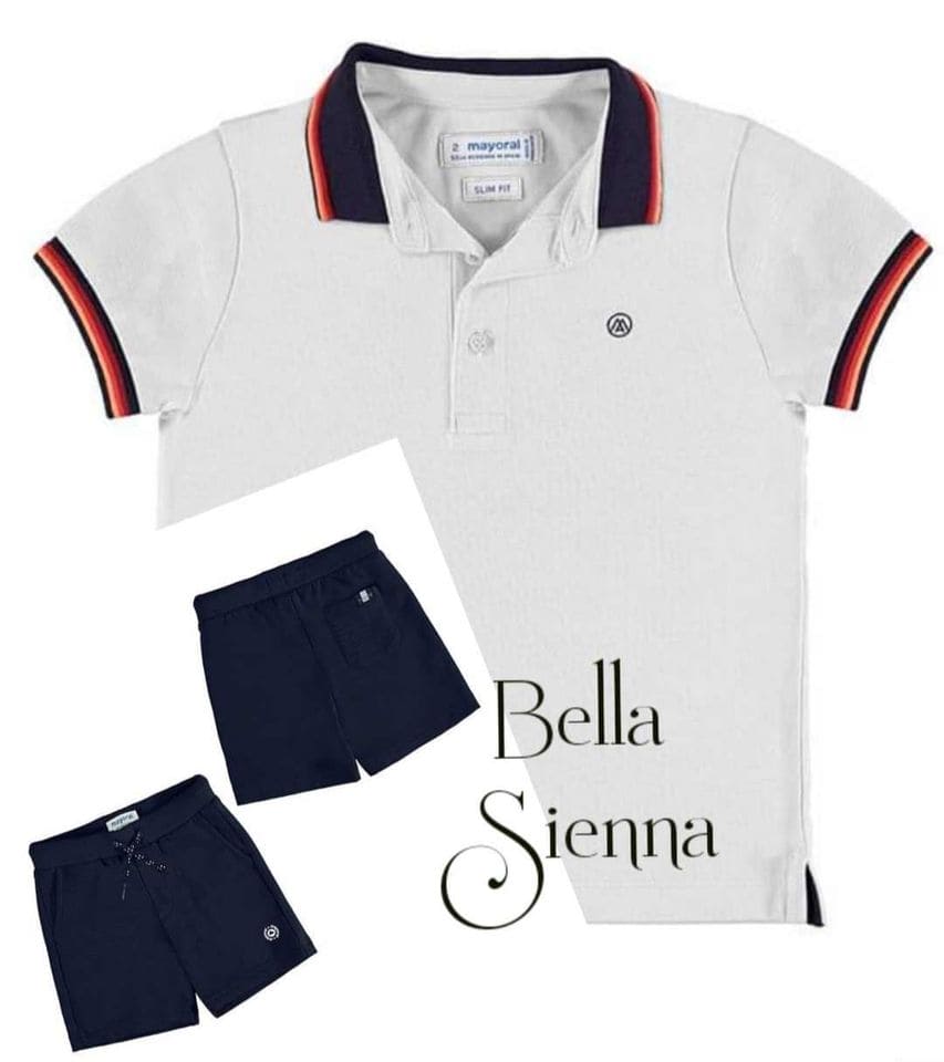 Very smart boys summer outfit from Mayoral that comes with a short sleeved polo top and a navy shorts. superb quality material 100% cotton top and 100% shorts.