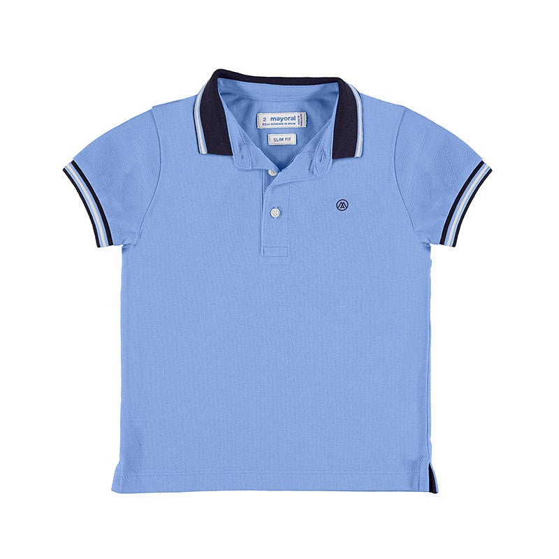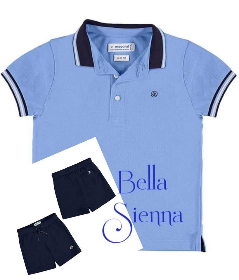 Very smart boys summer outfit from Mayoral that comes with a short sleeved polo top and a navy shorts. superb quality cotton top and shorts.