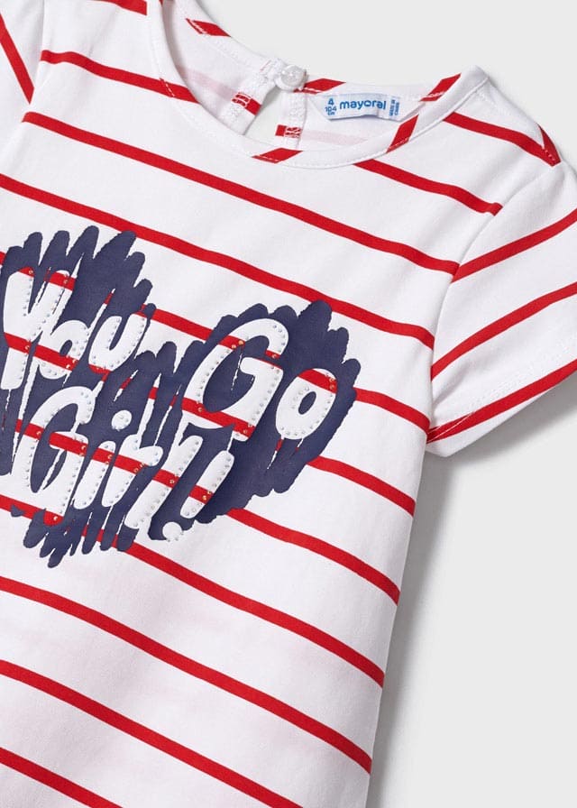 Mayoral Red Stripe Jumpuit! Its vibrant color, bold stripes, make it perfect for summer days spent having fun in the sun. Perfect for any occasion.