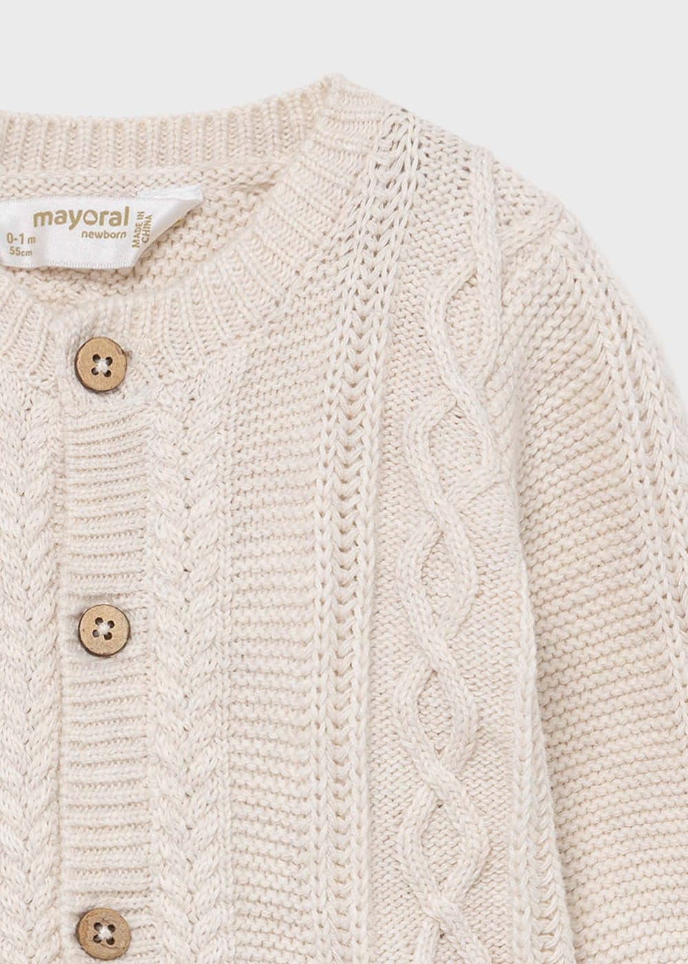 Long sleeved Cardigan for Newborn boy 0 to 18 months. Round neckline. Button fastenings down the front.