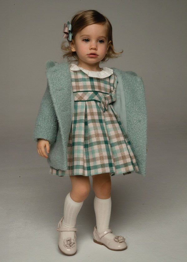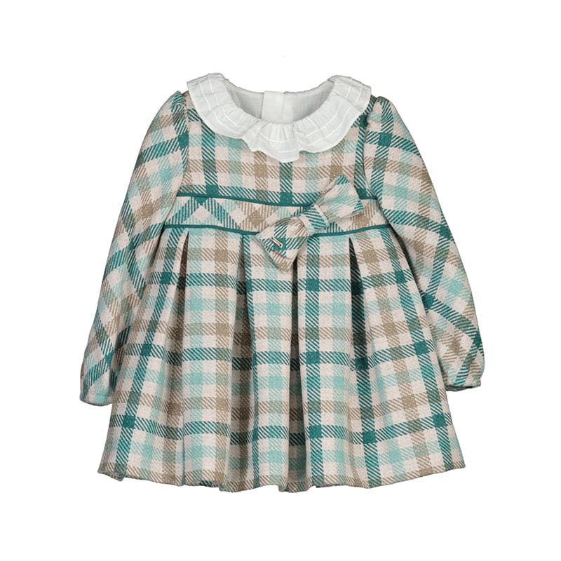 Adorable girls plaid pink dress by Mayoral this dress is perfect for the cold winter months. Crafted from a soft blend of viscose and wool, it features a bow on the waistband and a frilled collar. The dress is lined with lightweight cotton for comfort, and has puffed sleeves.