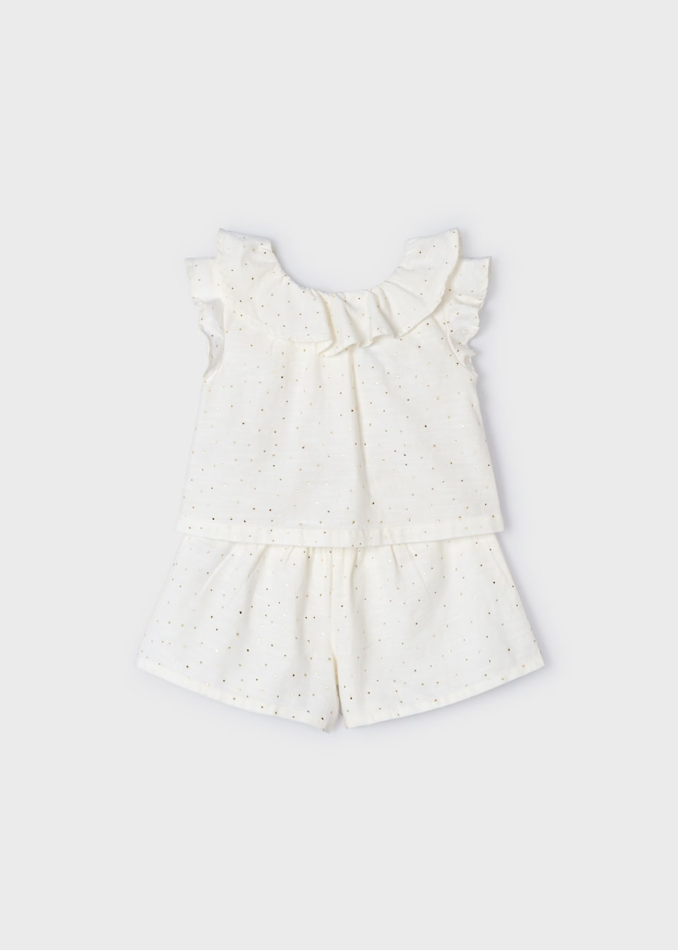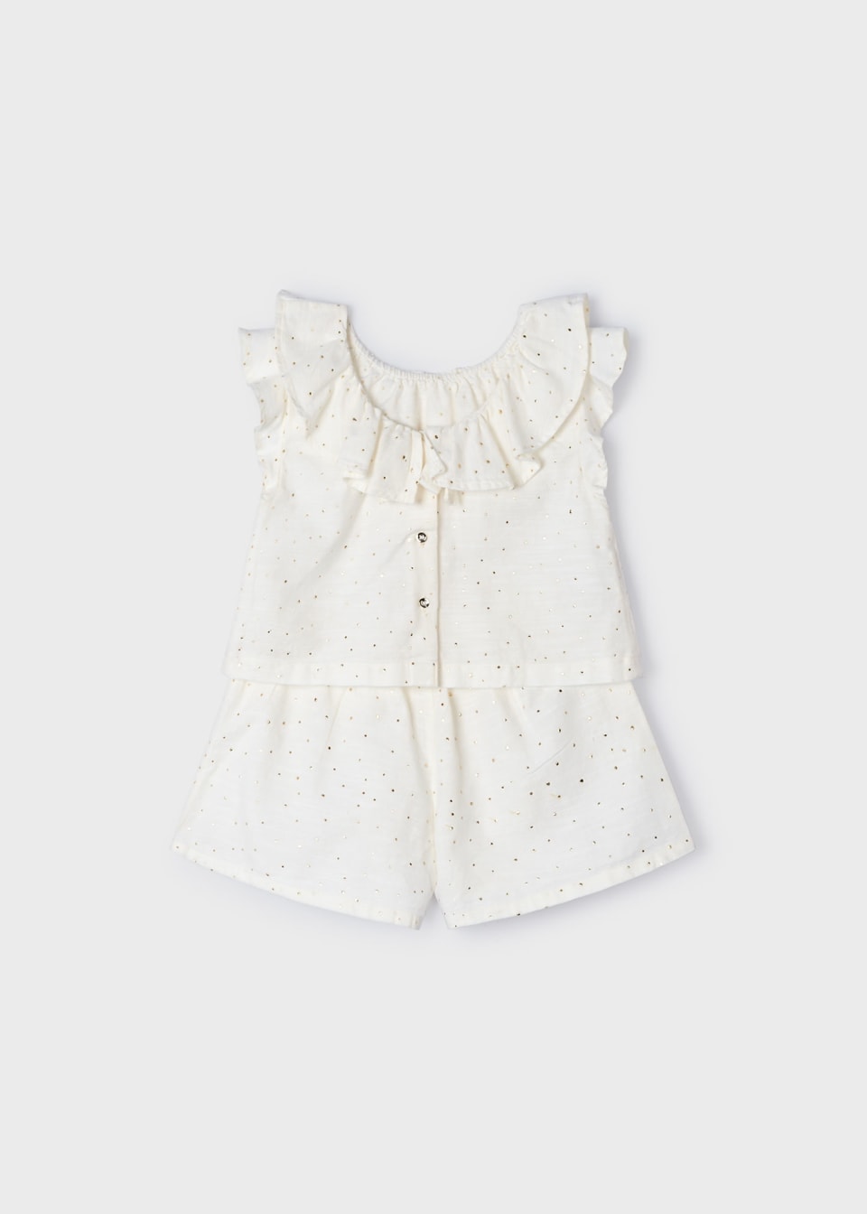 Mayoral 2-piece set. The top has a ruffle collar ivory gold polka dot matching shorts have adjustable waist to provide a comfortable fit, perfect for all-day wear.